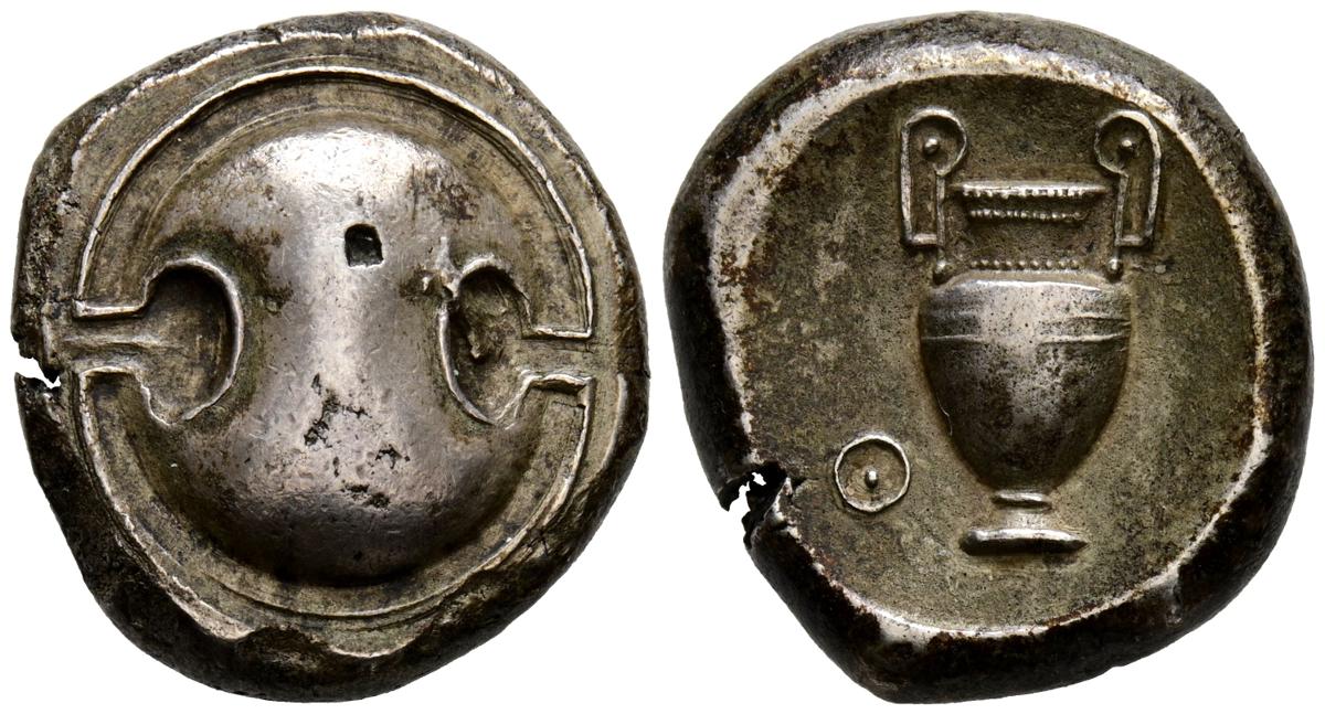 BOEOTIA, Thebes. Stater. (Ar. 12.42g/22mm). 395-387 Fine (Seaby 2389 var; BPoor 91). Obv: Boeotian shield. Rev: Two-handled amphora, Greek letter on the left. Extremely Fine-. Punch on obverse. Caprara forgery.