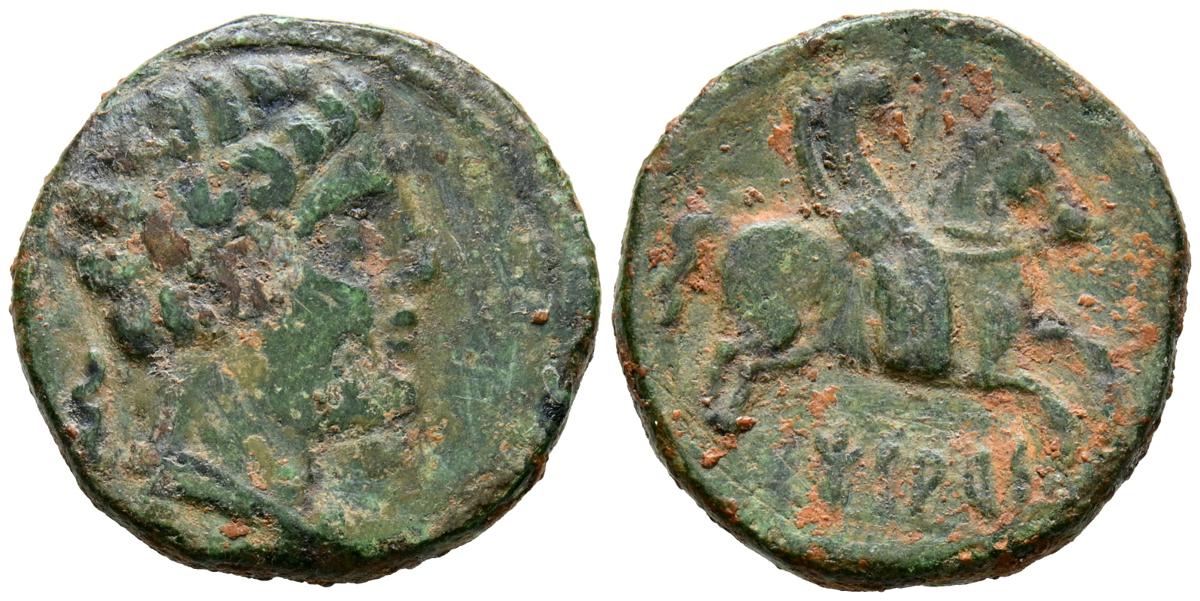 English SESARS (Aragon area). Semis. (Ae. 6.74g/22mm). 120-20 Fine (FAB-2200). Anv: Male head right, behind Iberian letter: S. Rev: Pegasus right, below Iberian legend: SESARS. VF-. Cleaned.