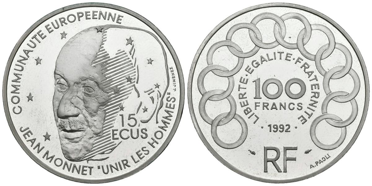 FRANCE. 100 Francs. 15 Ecus. Jean Montnet. 1991. (Ar. 22.29g/37.00mm). proof.