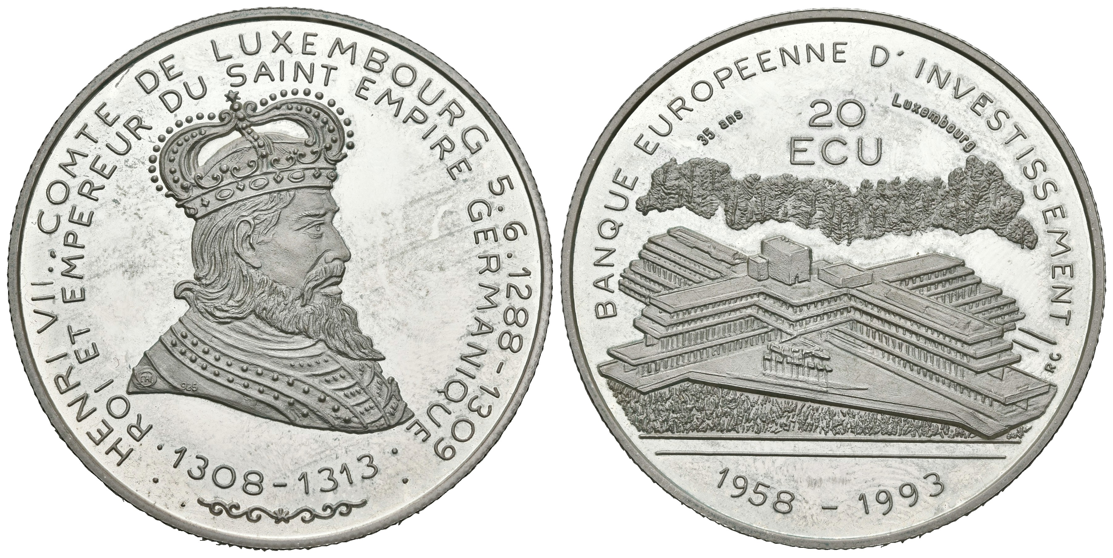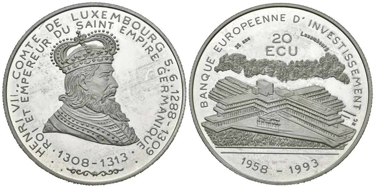 English LUXEMBOURG. 20 Ecu. European Research Bank. 1993. (Ar. 24.94g/38.3mm). proof