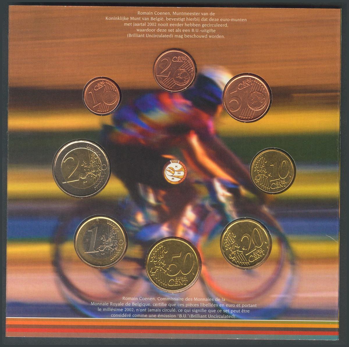 English BELGIUM. World Cycling Champions Set-Wallet composed of 8 Values of 2 Euros and dividers in nickel and copper. 2002. PROOF.