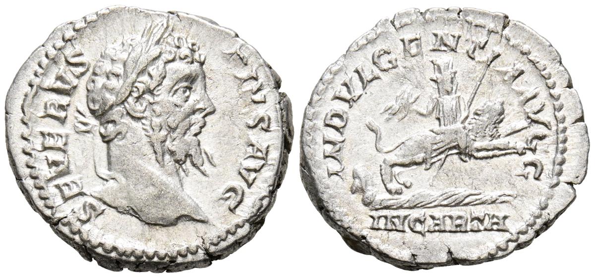 SEPTIMIO SEVERUS. Denarius. (Ar. 3.29g/19mm). 203 AD Rome. (RIC 266). Obverse: Laureate bust of Septimius Severus facing right, around legend: SEVERVS PIVS AVG. Reverse: Caelestis with lightning bolt and sceptre on lion facing right, in exergue: INCARTH, around legend: INDVLGENTIA AVG. VF+.