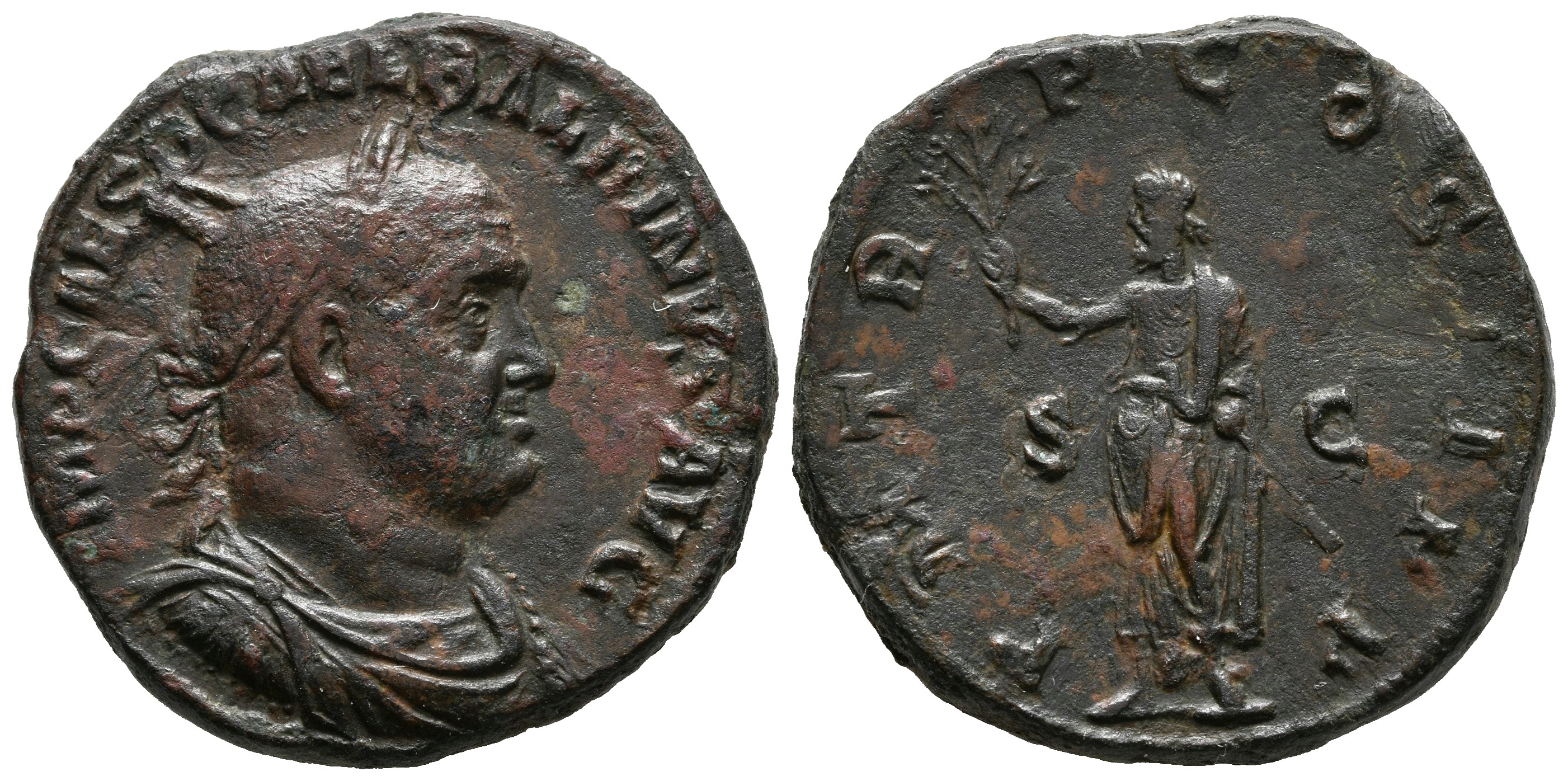 BALBINUS. Sestertius. (Ae. 20.28g/30mm). 238 AD Rome. Obv: IMP CAES D CAEL BALBINVS AVG. Laureate, draped and cuirassed bust right. Rev: PM TR P COS II P P. Balbinus standing left carrying olive branch and dagger, between Uncirculated. (RIC 16). VF+. Scarce.