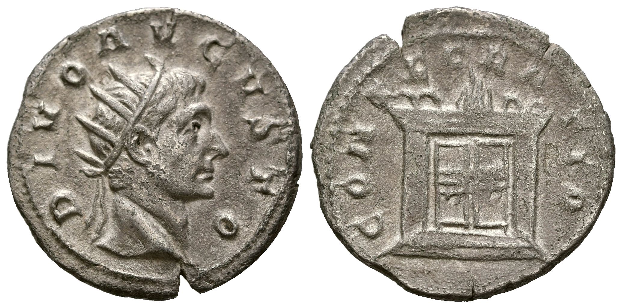 DIVO AUGUSTUS. Antoninian. (Ar. 3.81g/22mm). 250-251 AD (Coined under the name of Trajan Decius). Rome. (ICR 78). Obv: Radiate head of Augustus to right, legend around: DIVO AVGVSTO. Rev: Altar lit, around legend: CONSECRATIO. Very Fine. Scarce specimen.