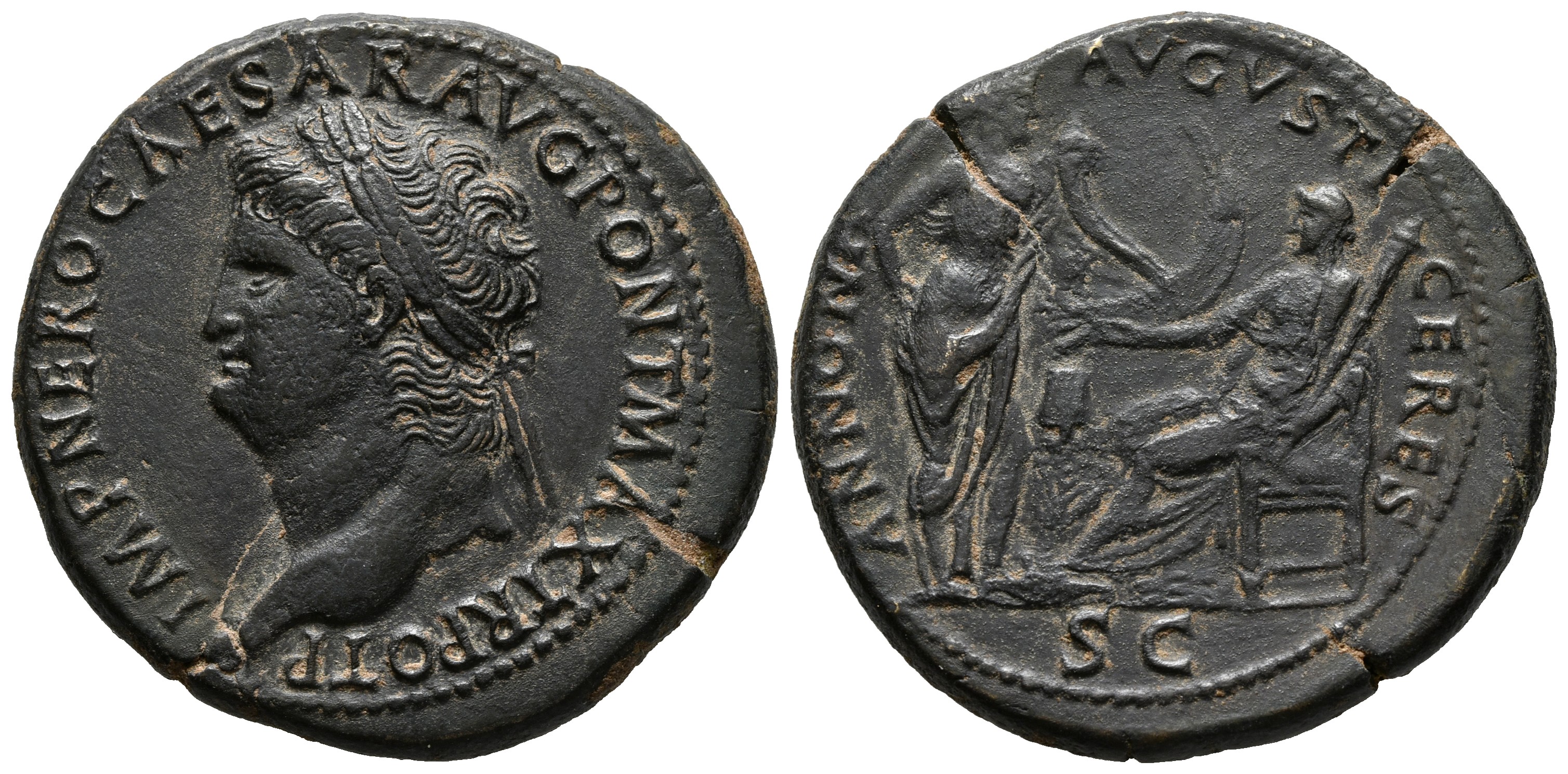 English NERO. Sestertius. (Ae. 26.18g/36mm). 65 AD Lugdunum. (RIC 495). Obv: Laureate bust of Nero facing left, around legend: IMP NERO CAESAR AVG PONT MAX TR POT P P. Rev: Ceres seated left carrying a torch and wheat ears, in front Annona carrying a cornucopia, between them a modium and behind a prow, in exergue: Uncirculated, around legend: ANNONA AVGVSTI CERES. Extremely Fine. Cleaned and fields lowered, although a rare specimen.