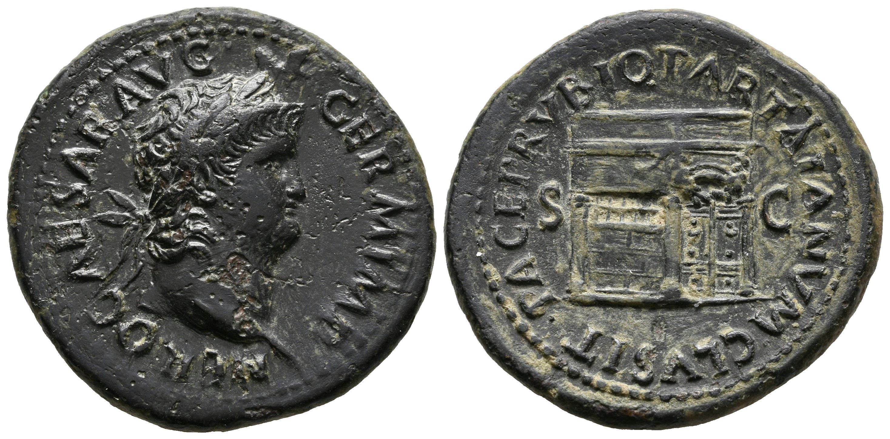 NERO. As. (Ae. 14.41g/31mm). 66 AD Rome. Obv: NERO CAESAR AVG GERM IMP. Laureate bust facing right of Nero. Rev: PACE PR VBIQ PARTA IANVM CLVSTI. Temple of Janus, between Uncirculated. (RIC 349). VF+. Contemporary patina.