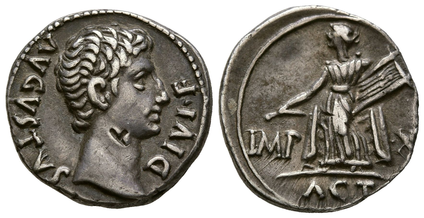 AUGUSTUS. Denarius. (Ar. 3.80g/19mm). 15-13 BC Lugdunum. (ICR 171a). Obv: Head of Augustus to right, around legend: DIVI F AVGVSTVS. Rev: Apollo standing left holding plectrum and lyre, between: IMP-X, in exergue: ACT. Extremely Fine. Banker's mark on obverse. Nice specimen, scarce and more so.