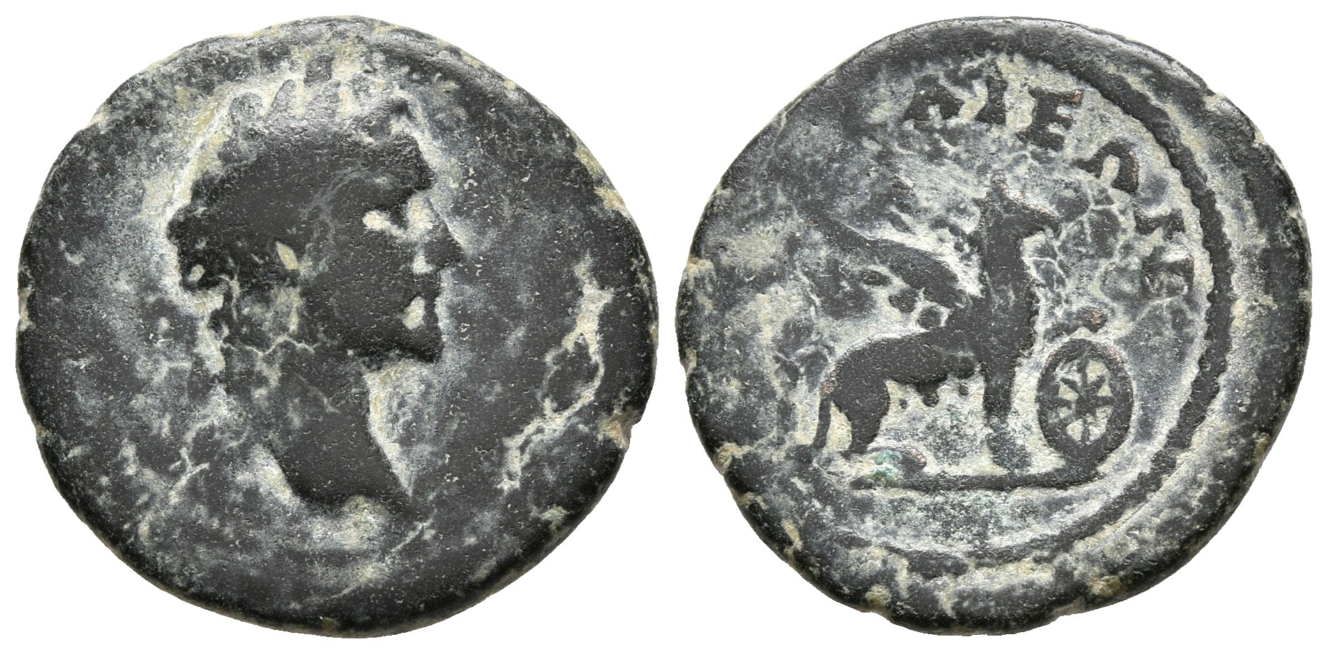 ANTONINUS PIUS. Ae20. 138-161 AD Bithynia, Nicaea. A/ Laureate head facing right. R/ Griffin sitting right, resting its foreleg on a wheel. RPC IV online 5900.1=RG 115. Ae. 4.61g. Fine/VF-. Very rare.