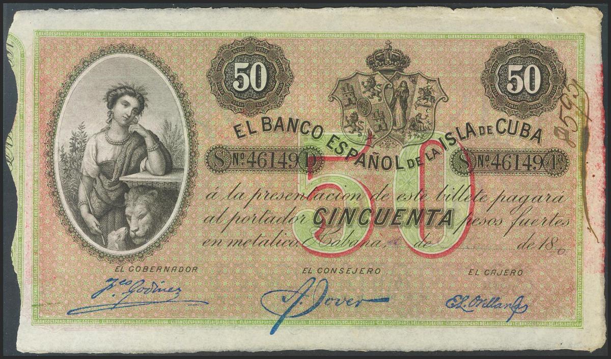 CUBA. 50 pesos. May 15, 1896. SILVER overload. (Edifil 2017: 83). Good Extremely Fine.