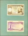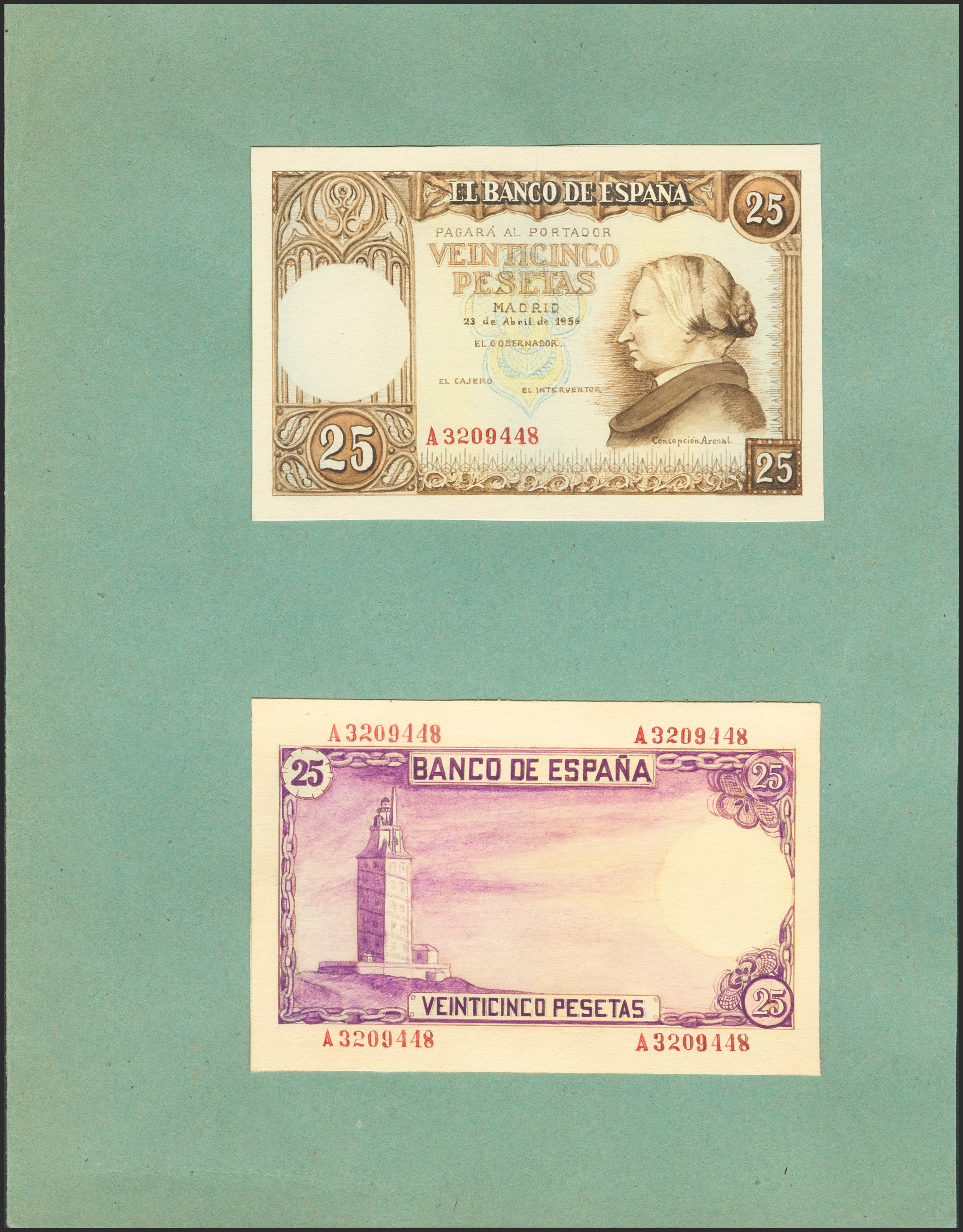 Project of a non-adopted 25 pesetas banknote represented by the front and back on cardboard, dated April 23, 1956. The front represents Concepción Arenal and the back shows the Tower of Hercules, two Galician elements in the design (remember that Galicia appears for the first and only time in the 500 pesetas of 1979, with RosalÃa de Castro). It is a unique complex of exceptional beauty, worthy of a museum. The banknote is built using the gouache technique, tinting the colors by diluting them with water, and is a magnificent example of a complete design of a possible banknote produced by artists from the FMNT The obverse is finished since it is contemplated until the possible printing of the offset of the funds. The reverse shows a lot of empty space, but provides a poetic suggestion of the watermark like the sun on the sea. The global design has a theme that perhaps would have fit better in the 1946 broadcast, with humanists such as Father Vitoria and Luis Vives, but it certainly fit with the proposal of relevant cultural figures from Spain that had been developing. We do not know the authorship of the project, but he must have been one of the best draftsmen / engravers since it is completely finished. Perhaps the reverse, simpler of lines, was not by the same author, although we cannot affirm it. Despite the fact that the drawing is well made, the set seems too traditional for the date and has little elaborate borders, reminiscent of its composition at the 500 pesetas of 1940 from Señor de Orgaz. The sketch is dated April 1956, so, according to Don Ramón Cobo Huici, if accepted, it would have been in circulation around the end of 1958/59. In 1956, Albéniz's 1954 25-peseta banknote had just begun to be manufactured (in 1955), so we think that this very advanced sketch would belong to a project for a reserve issue. However, the 1957 authorization for the issuance of metallic currency cut off this project. In 1953 and 1954, Taylor minters were installed to produce the new nickel coins of 5, 25 and 50 pesetas dated 1957. In fact, the 5-pesetas note from 1951 stopped being manufactured in 1956 and the 25 and 50 pesetas , which had just begun to be printed, were allowed to circulate for a few more years and their production stopped in the same year (1963). By making the value of 25 pesetas on paper obsolete, the need to continue printing banknotes of that value was abolished. For this reason, this sketch had no possibility of being engraved. Unique piece of enormous interest.