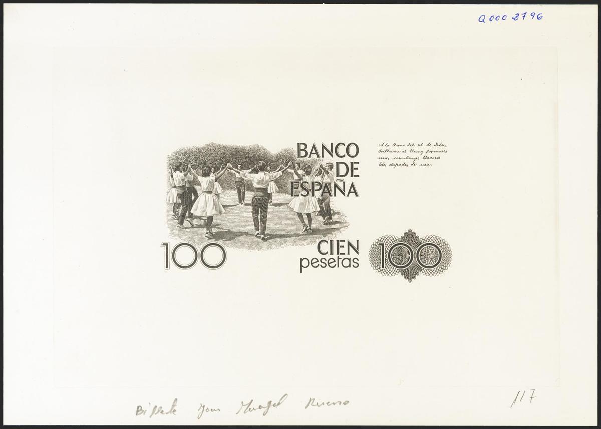 Final proof in black of the reverse of a non-adopted draft of a 100 Pesetas note dedicated to the Catalan poet Joan Maragall and with a proposed date of issue of March 14, 1980 and manuscript in blue ink Q0002796. (Edifil 2017: NE71P, back). Piece of enormous spectacularity and extremely rare.