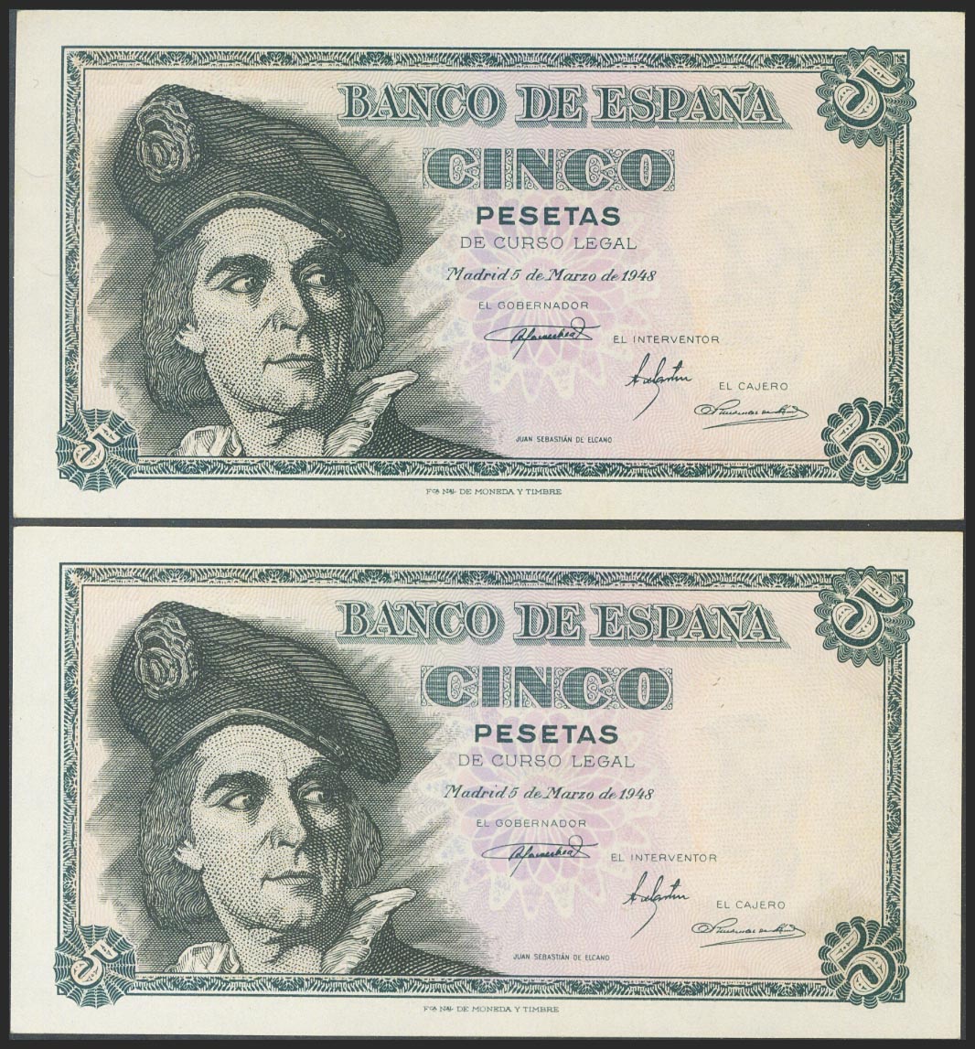 5 pesetas. March 5, 1948. Correlative couple. Series E. (Edifil 2017: 455a). Original sizing. Uncirculated.