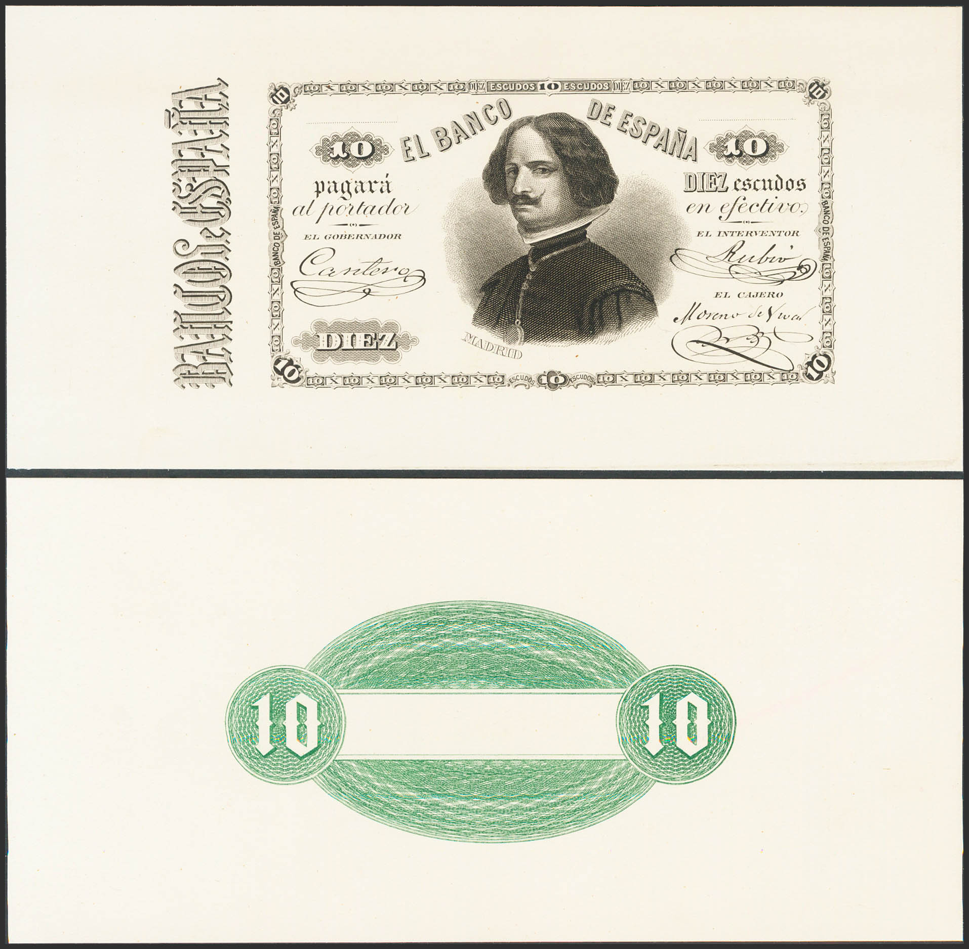 10 Escudos. 1 de Mayo de 1873. Pruebas de anverso y reverso. Sin serie y con firmas. (Edifil 2021: 255P, 255Pa). Muy raras. SC.