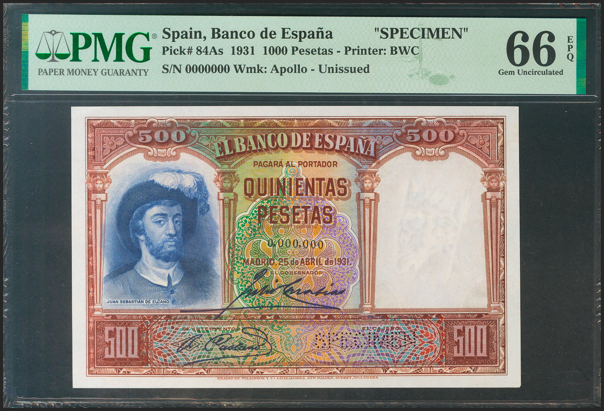 500 Pesetas. 25 de Abril de 1931. Numeración 0.000.000, taladrado SPECIMEN en el lugar destinado a la firma del cajero. (Edifil 2021: 361M, Pick: 84As). RarÃsimo, además de una excepcional calidad y apresto original. SC. Encapsulado PMG66EPQ.