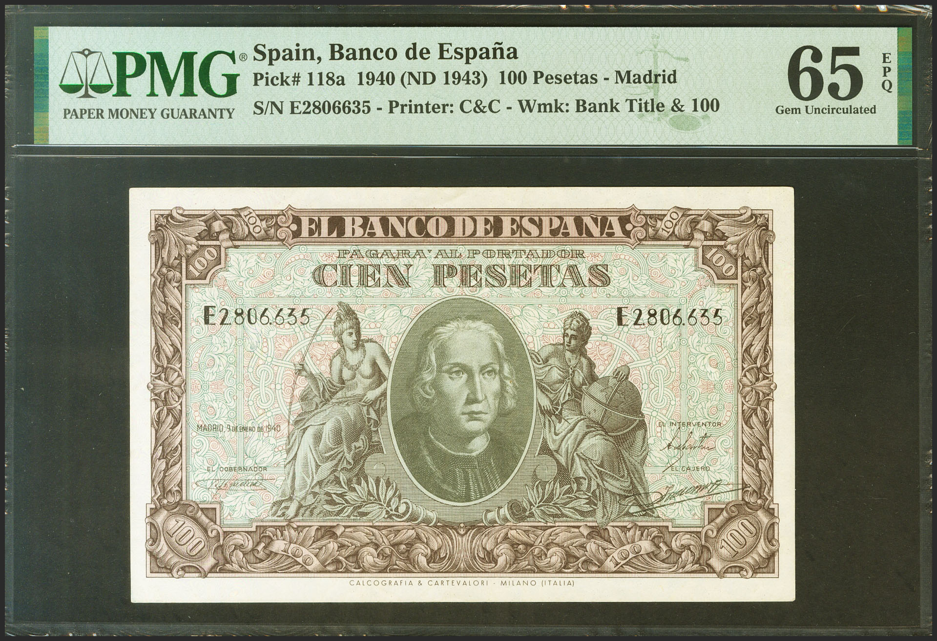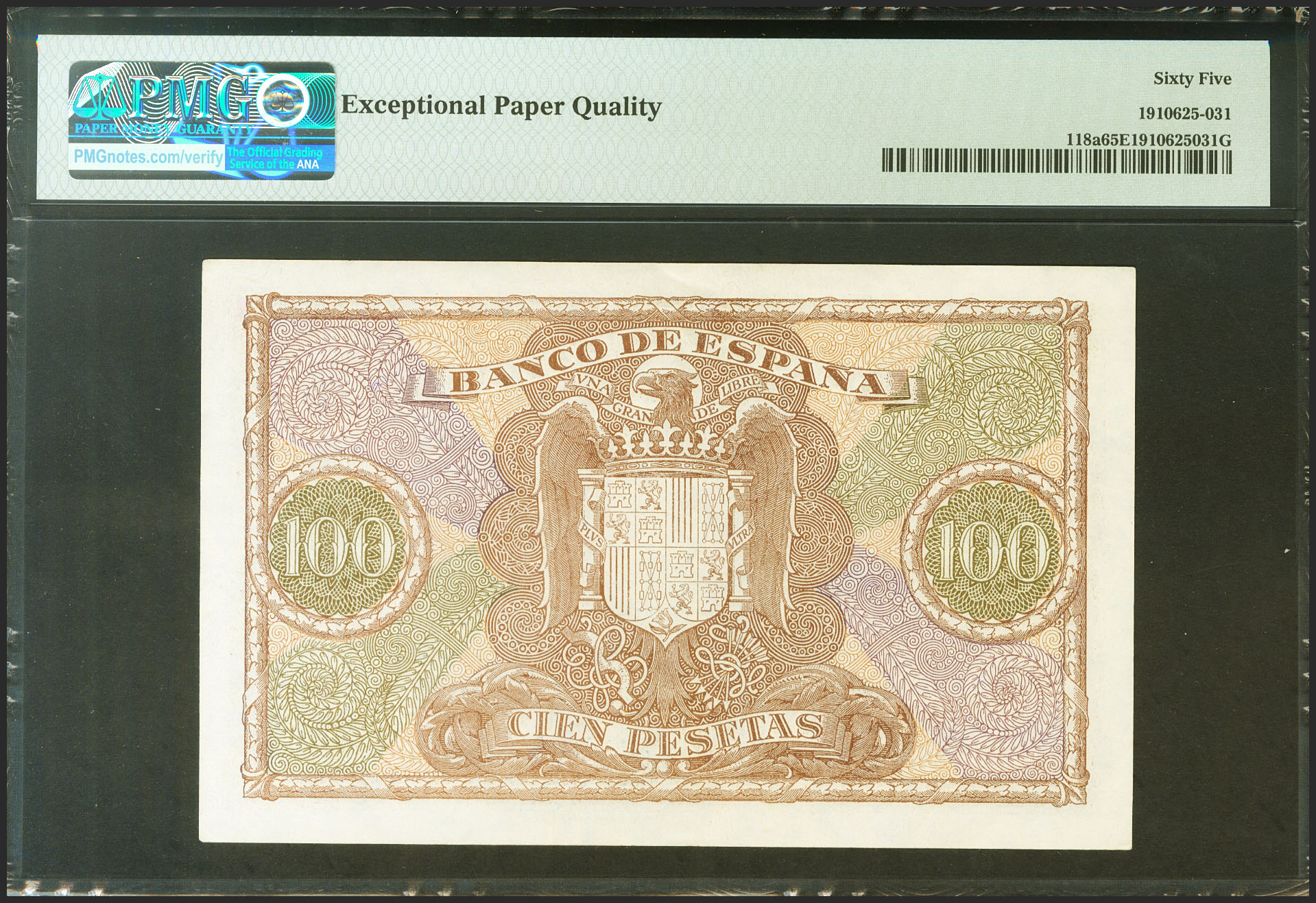 100 pesetas. January 9, 1940. Series E. (Edifil 2021: 438a, Pick: 118a). Rare in this exceptional quality, original sizing. Uncirculated. PMG65EPQ package.