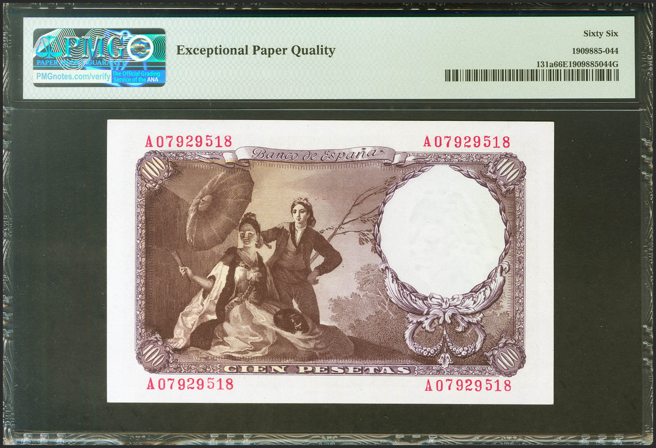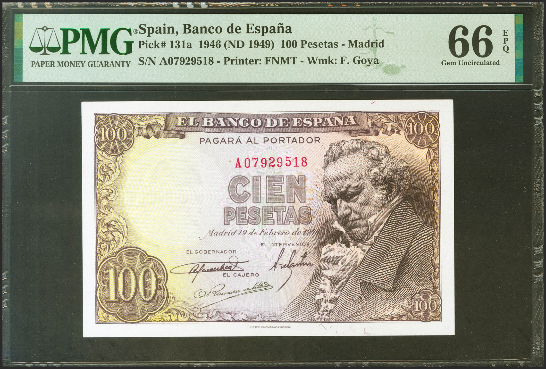 100 pesetas. February 19, 1946. Series A. (Edifil 2021: 451a, Pick: 131a). Rare in this exceptional quality, original sizing. Uncirculated. PMG66EPQ package.
