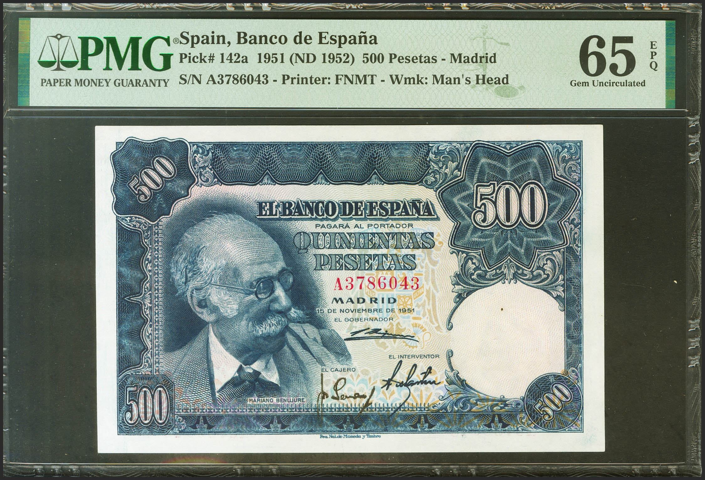500 pesetas. November 15, 1951. Series A. (Edifil 2021: 460a, Pick: 142a). Rare in this quality, original sizing. Uncirculated. PMG65EPQ package.