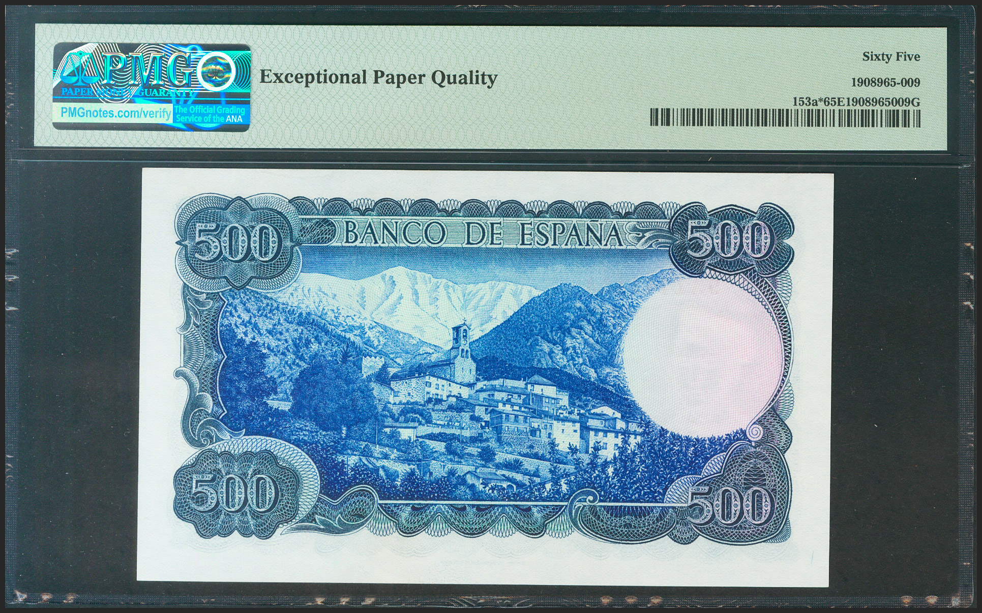 500 pesetas. July 23, 1971. Special series 9A. (Edifil 2021: 473b, Pick: 143a*). Rare in this quality, original sizing. Uncirculated. PMG65EPQ package.