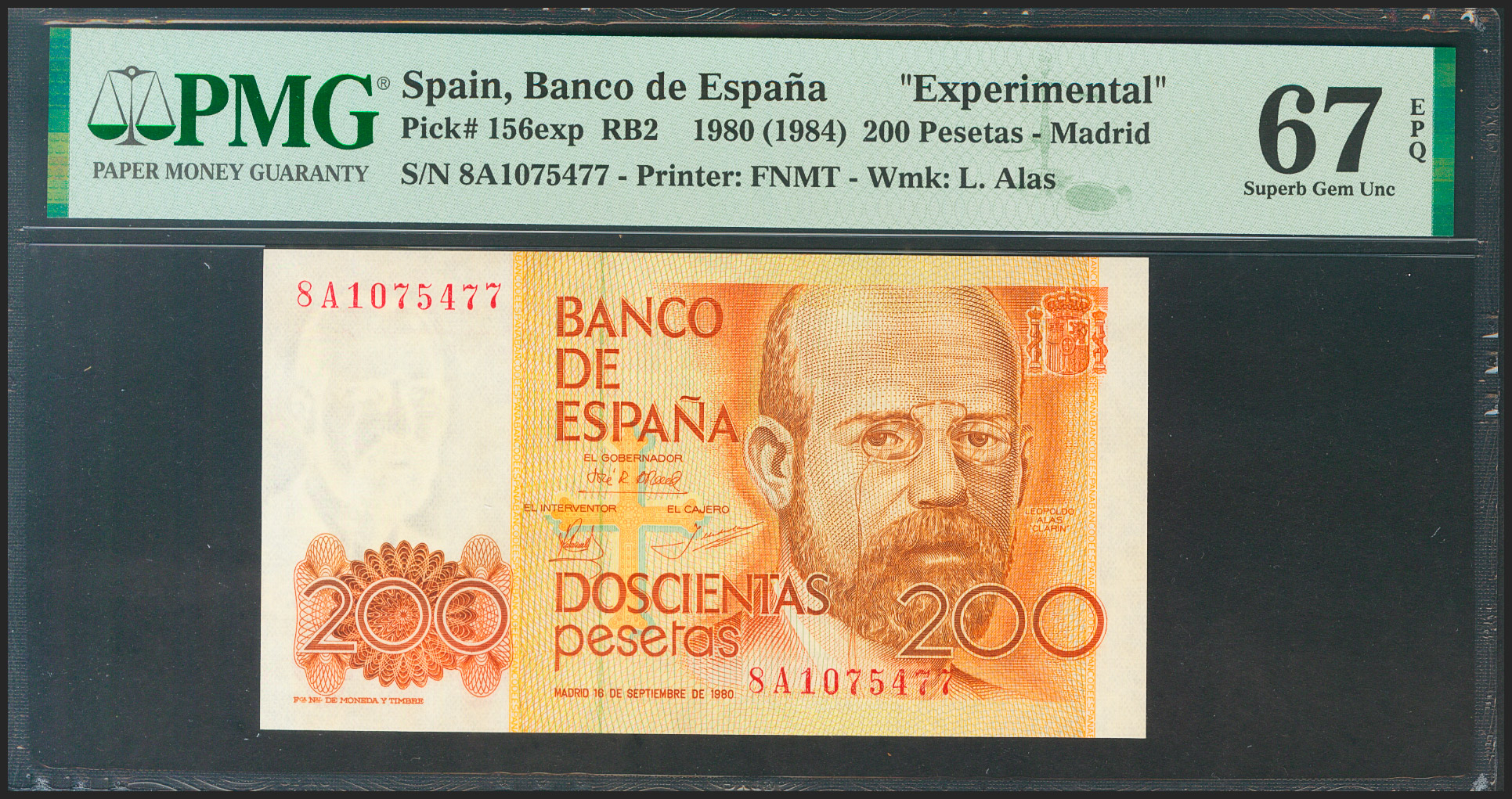 200 pesetas. September 16, 1980. Special series 8A. (Edifil 2021: 480c, Pick: 156exp). Very rare in this exceptional quality, original sizing. Uncirculated. PMG67EPQ package.