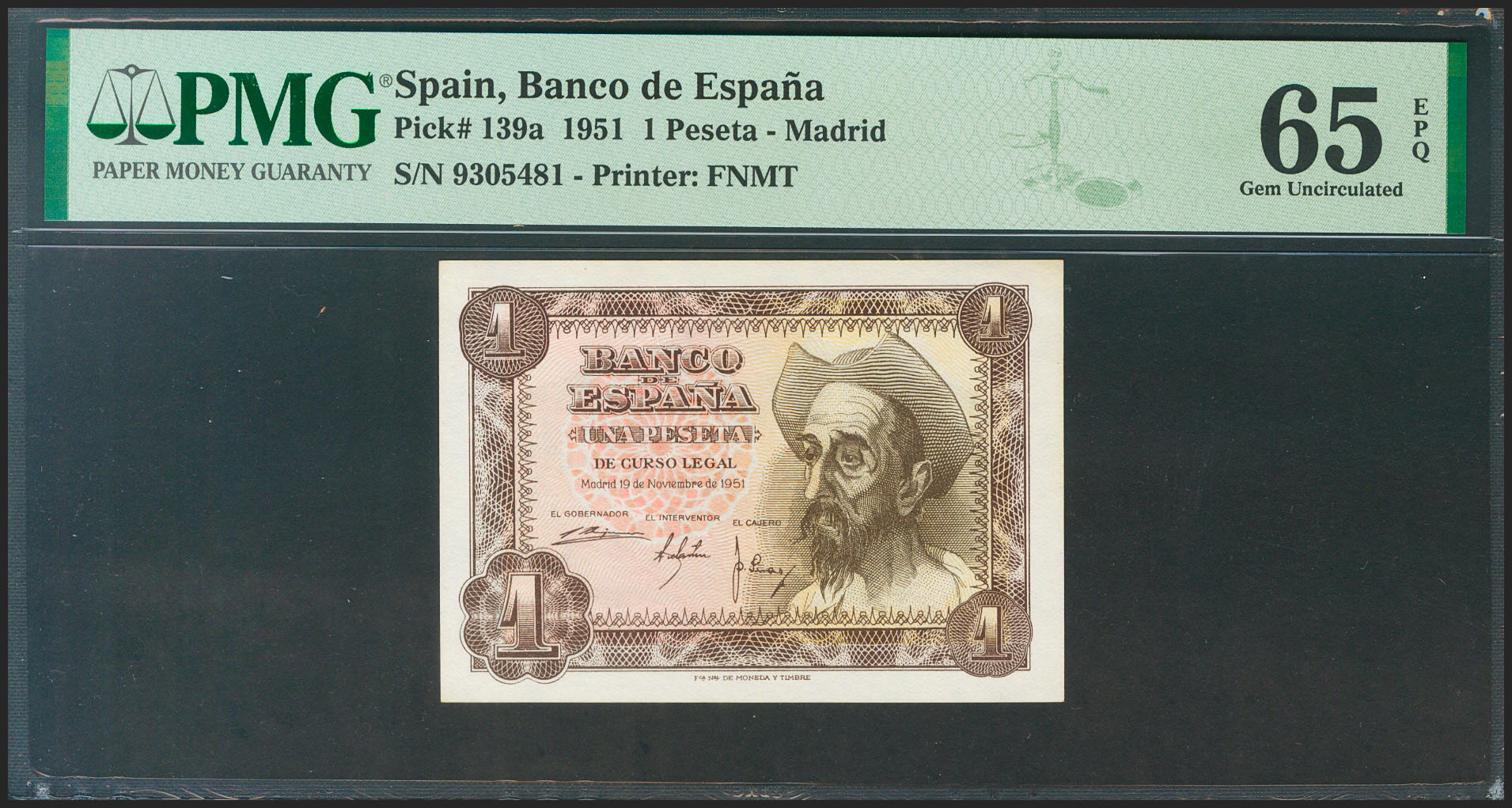1 Pesetas. 19 de Noviembre de 1951. Sin serie. (Edifil 2021: 461, Pick: 139a). Inusual en esta calidad, apresto original. SC. Encapsulado PMG65EPQ.
