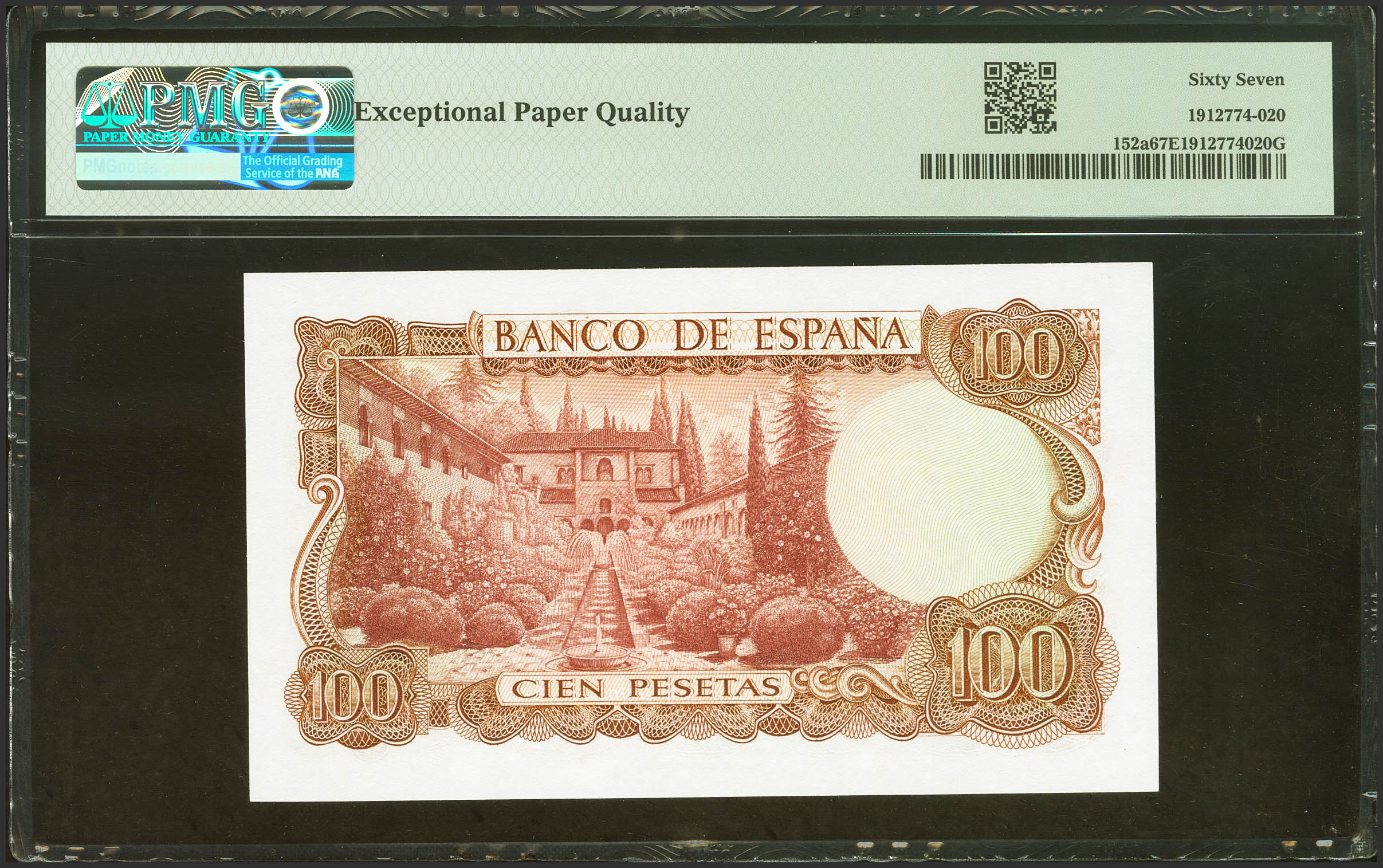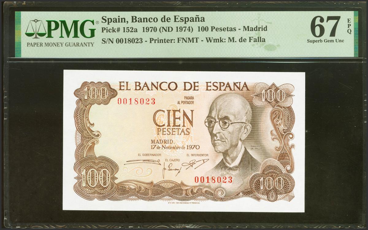 100 Pesetas. November 17, 1970. No series and very low numbering. (Edifil 2021: 472, Pick: 152a). Rare in this exceptional quality, original sizing. Uncirculated. PMG67EPQ package.