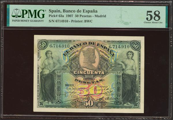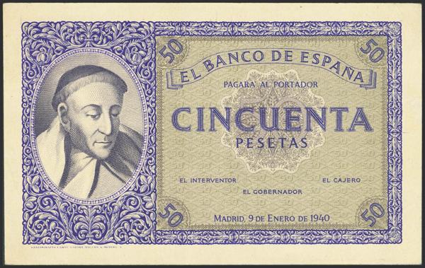 Prueba de anverso de un billete de 50 Pesetas fechado el 9 de Enero de 1940, fecha en la que fue emitida la serie completa de Cartevalori de 1940. (Edifil 2023: No catálogado, Filabo: No catálogado). Extraordinariamente raro, única prueba conocida con este diseño, que fue deshechado por el billete de Menéndez Pidal. SC-.
