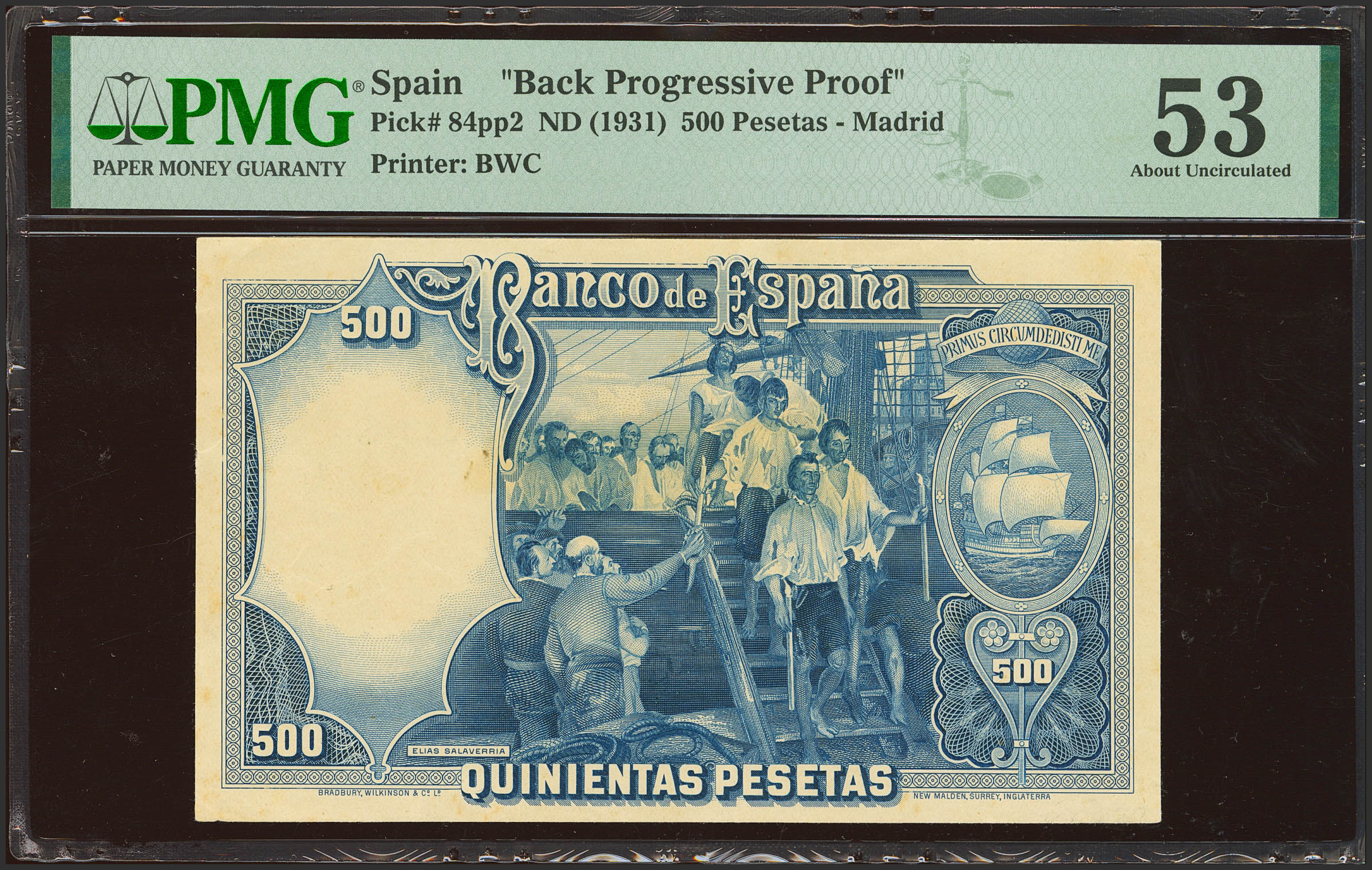 500 pesetas. Prueba de color del reverso del billete de Juan Sebastián Elcano. (Edifil 2023: 361Pb). RarÃsima. EBC. Encapsulado PMG53 (previously mounted).