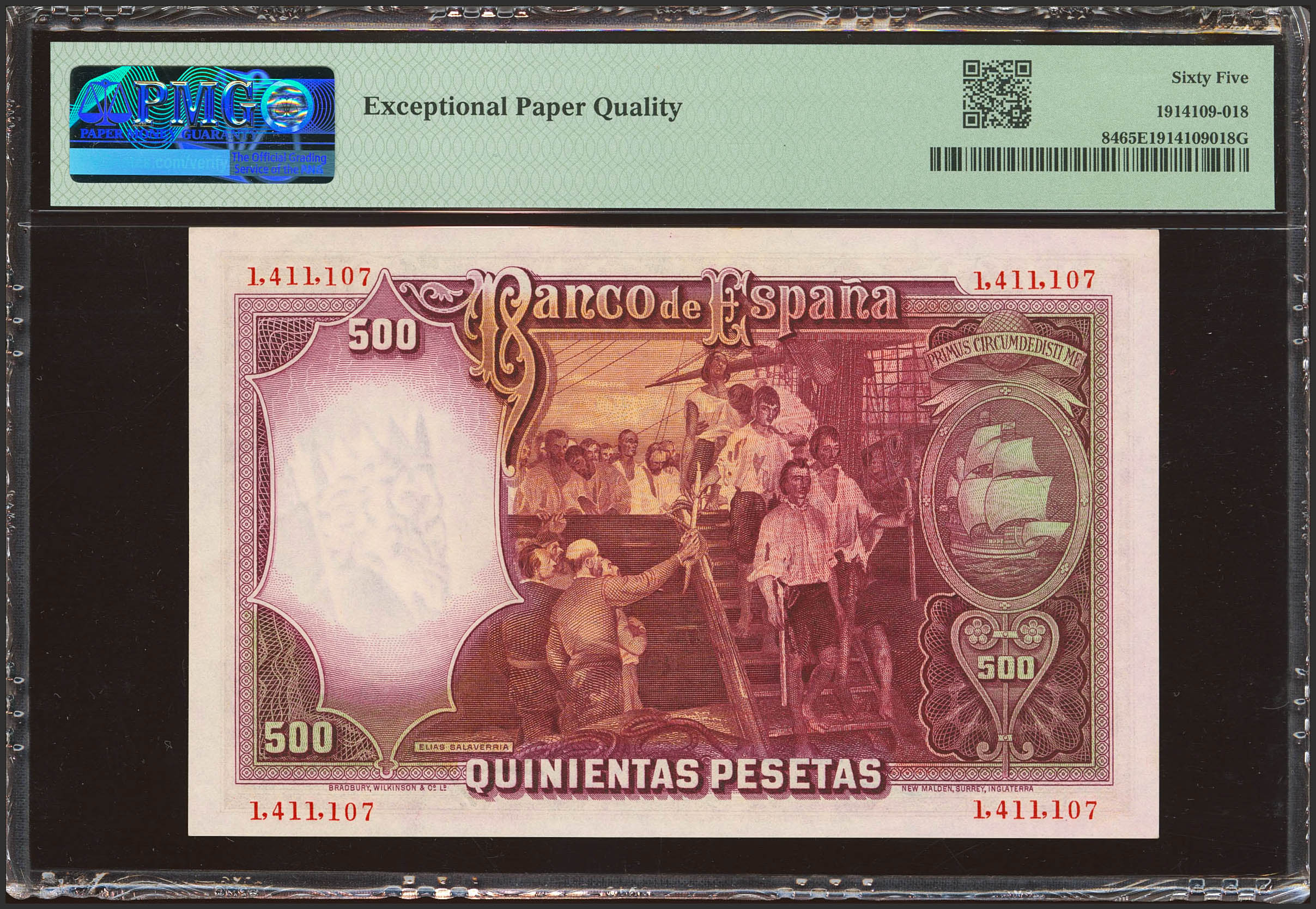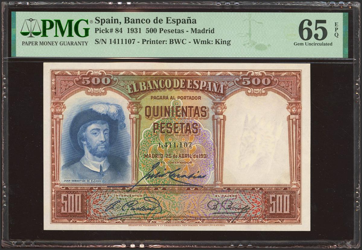 500 Pesetas. 25 de Abril de 1931. Sin serie. (Edifil 2023: 361, Pick: 84). Inusual en esta calidad, apresto original. SC. Encapsulado PMG65EPQ.