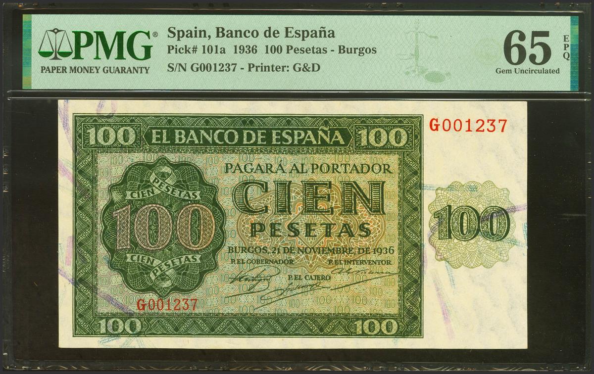 100 Pesetas. 21 de Noviembre de 1936. Serie G. (Edifil 2023: 421a, Pick: 101a). Inusual en esta calidad, apresto original. SC. Encapsulado PMG65EPQ.