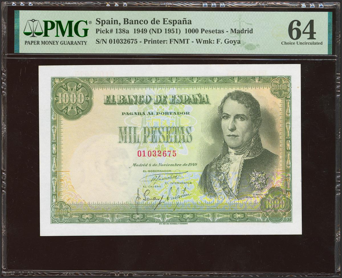 1000 Pesetas. 4 de Noviembre de 1949. Sin serie. (Edifil 2021: 458, Pick: 138a). Raro en esta excepcional calidad. SC. Encapsulado PMG64.