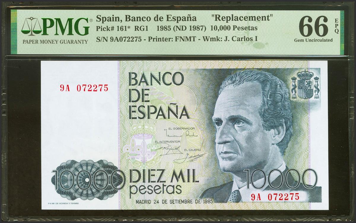 10000 Pesetas. 24 de Septiembre de 1985. Serie especial 9A. (Edifil 2021: 481b, Pick: 161*). Raro en esta excepcional calidad. SC. Encapsulado PMG66EPQ.