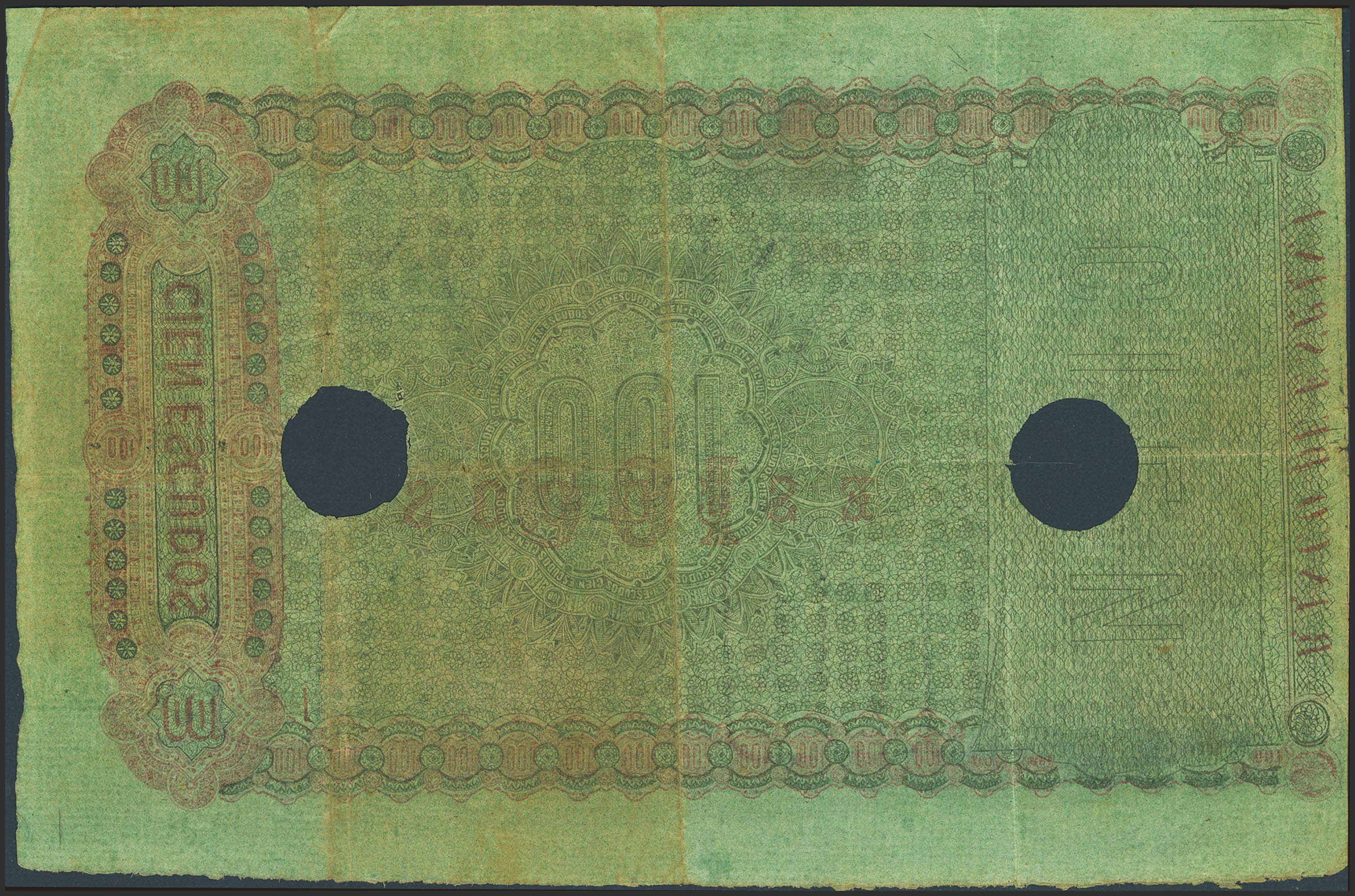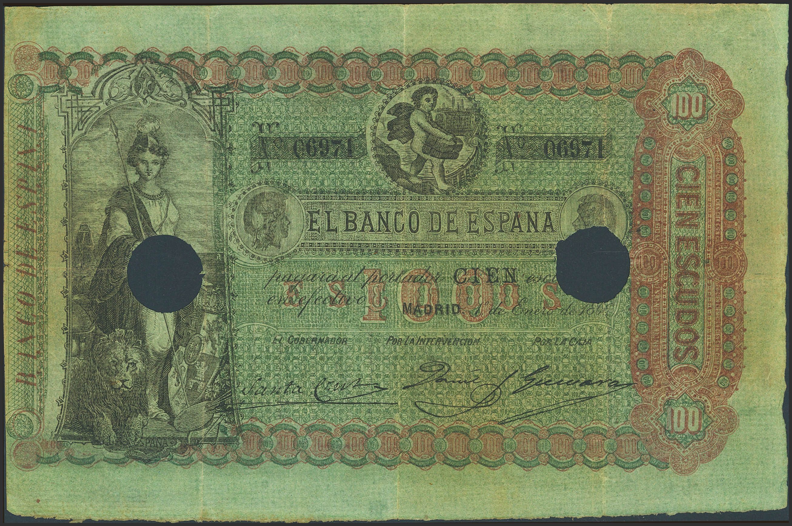 100 Escudos. 1 de Enero de 1866. Falso de época. Con numeración y taladrado. (Edifil 2023: 231F, Cobo F: 3b). Muy raro. MBC.
