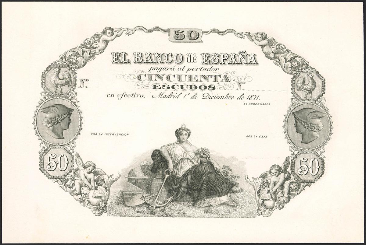50 Escudos. 1 de Diciembre de 1871. Prueba de anverso. Sin numeración y firmas, sobre cartulina blanca. (Edifil 2023: 246P). Rarísimo. SC-.