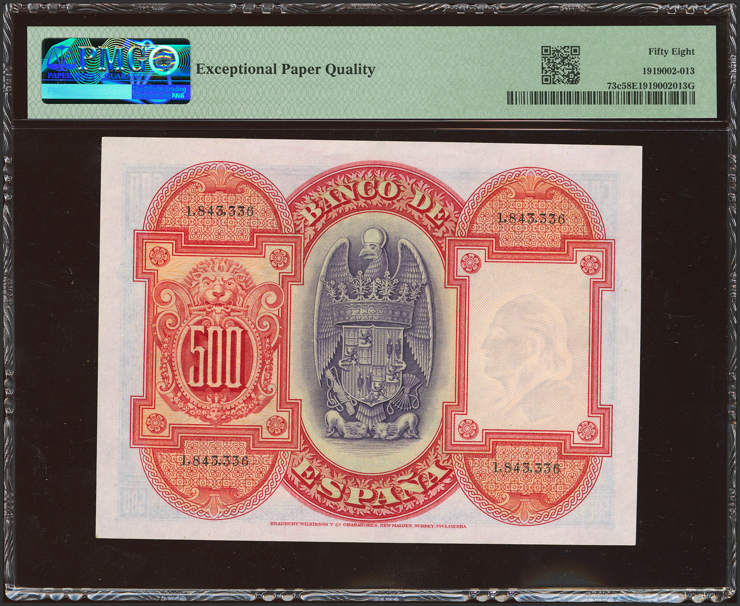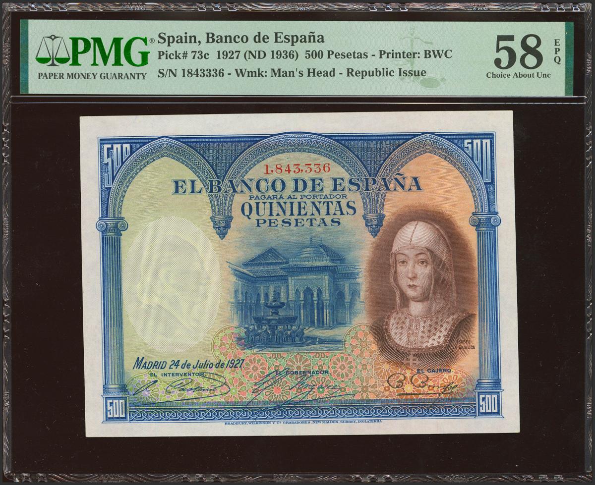 500 Pesetas. 24 de Julio de 1927. Sin serie y numeración posterior 1602000. (Edifil 2023: 352, Pick: 73c). Inusual en esta calidad, apresto original. EBC+++. Encapsulado PMG58EPQ.