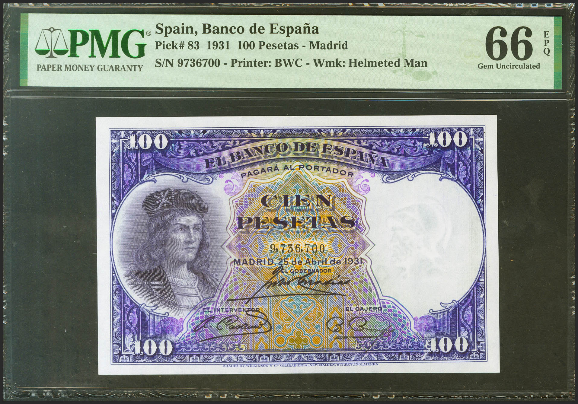 100 Pesetas. 25 de Abril de 1931. Sin serie. (Edifil 2021: 360, Pick: 83). Inusual en esta calidad, apresto original. SC. Encapsulado PMG66EPQ.