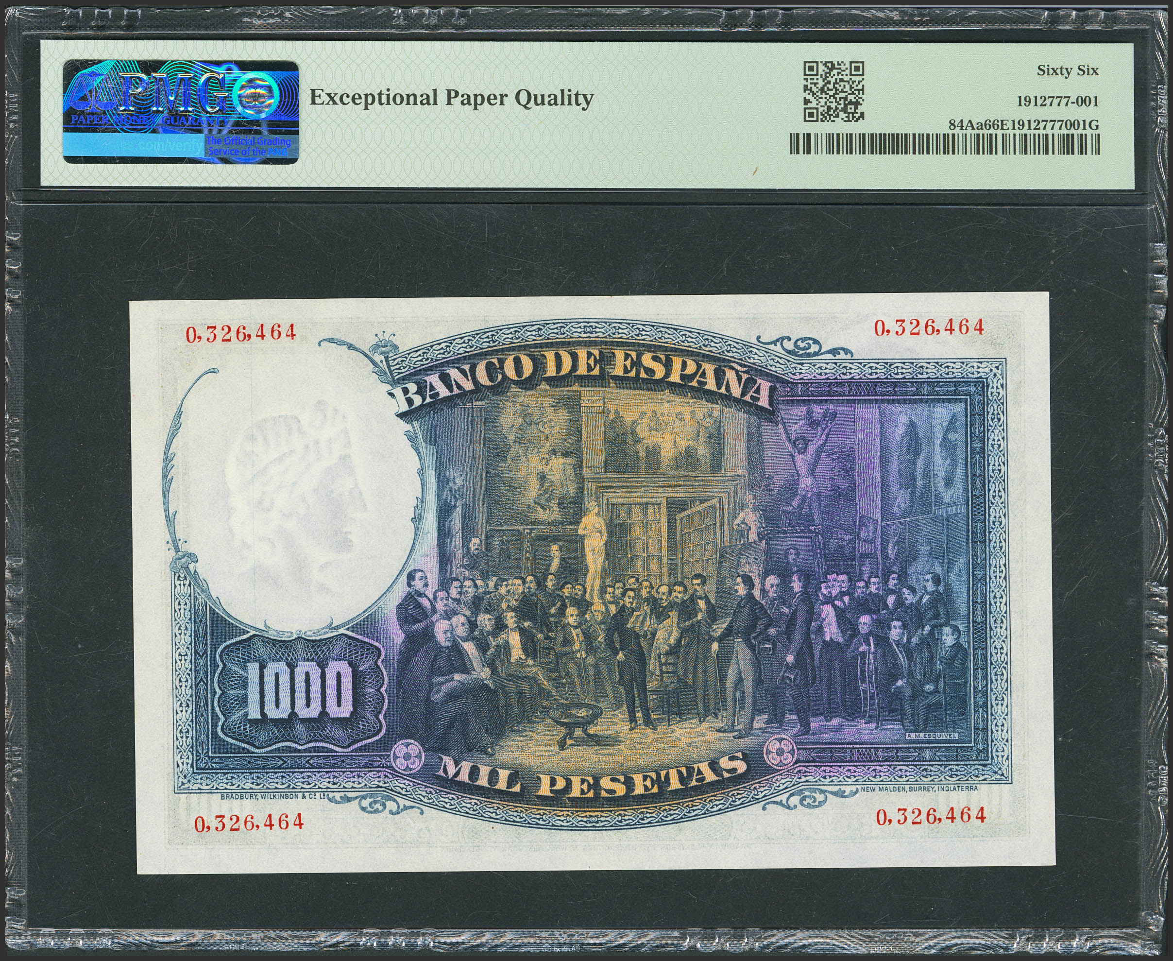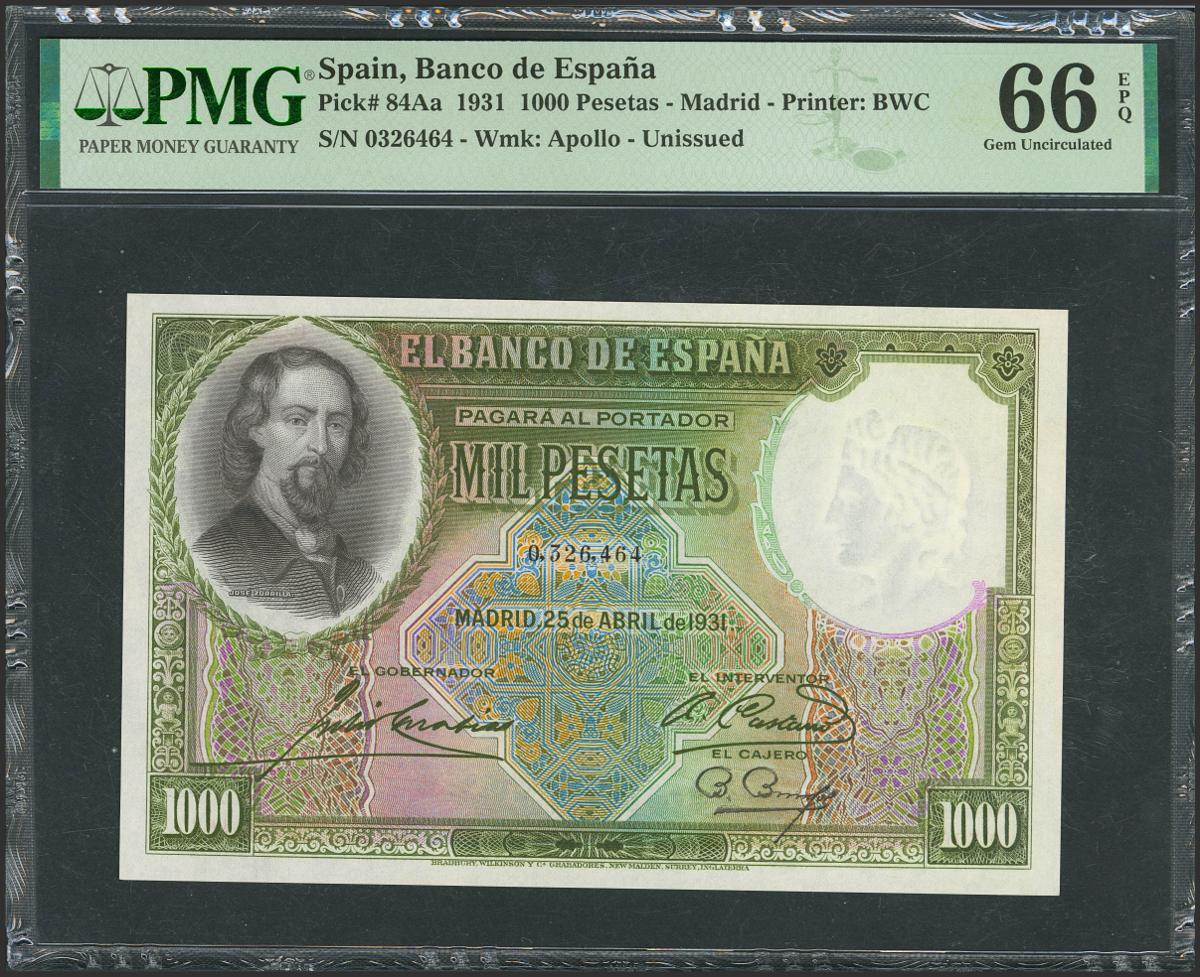 1000 Pesetas. 25 de Abril de 1931. Sin serie. (Edifil 2021: 362, Pick: 84Aa). Extraordinariamente raro en esta calidad, apresto original. SC. Encapsulado PMG66EPQ.
