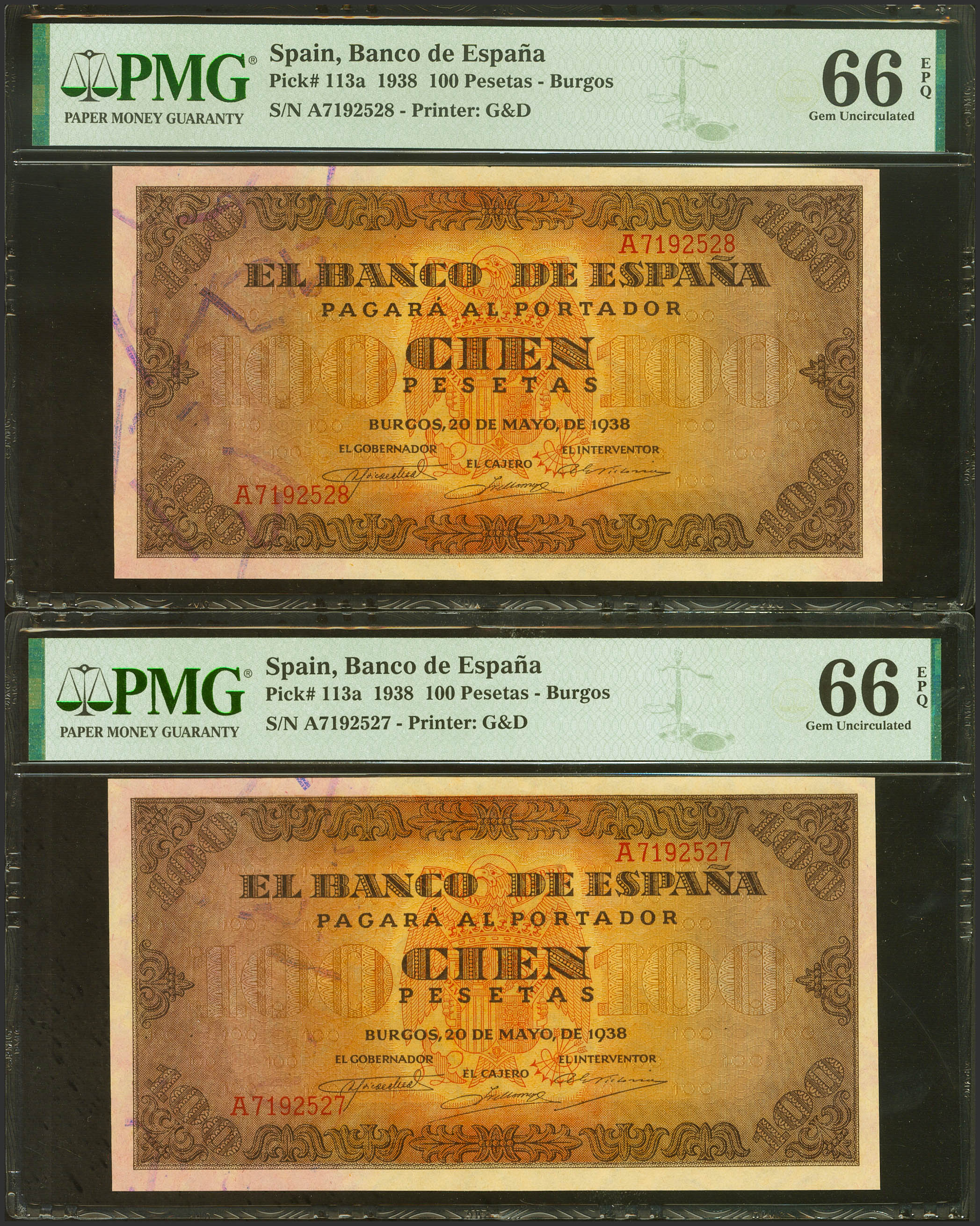 100 Pesetas. 20 de Mayo de 1938. Pareja correlativa. Serie A. (Edifil 2021: 432, Pick: 113a). Muy raro en esta excepcional calidad, apresto original. SC. Encapsulado PMG66EPQ, ambos.