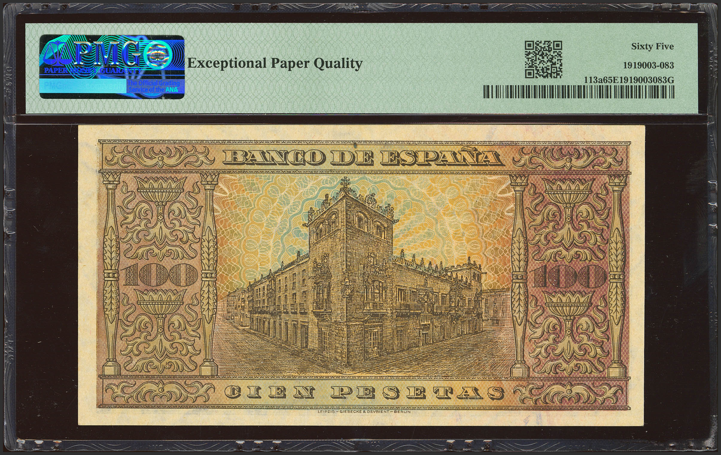 100 Pesetas. 20 de Mayo de 1938. Serie D. (Edifil 2023: 432a, Pick: 113a). Inusual en esta excepcional calidad, apresto original. SC. Encapsulado PMG65EPQ.