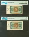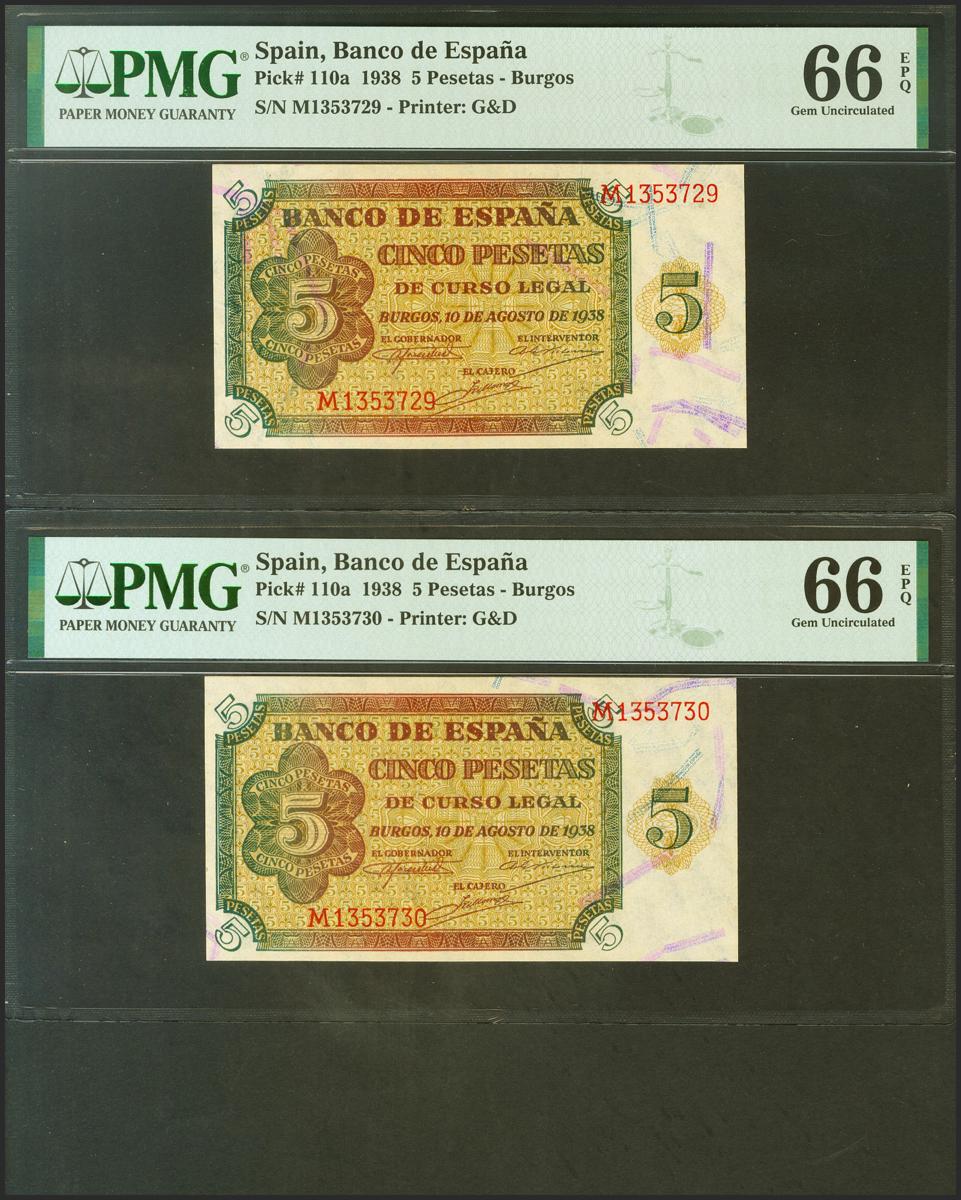 5 Pesetas. 10 de Agosto de 1938. Pareja correlativa. Serie M, última serie emitida. (Edifil 2021: 435b, Pick: 110a). RarÃsima serie, especialmente en esta excepcional calidad, apresto original. SC. Encapsulados PMG66EPQ, ambos.