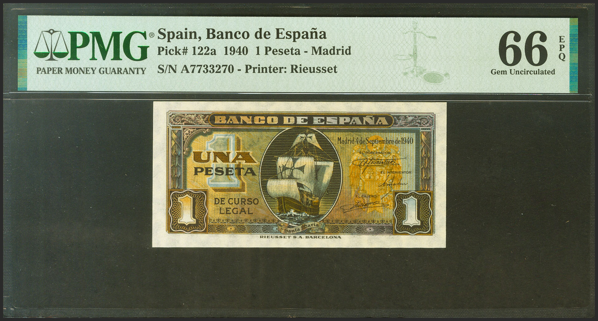 1 Peseta. 4 de Septiembre de 1940. Serie A. (Edifil 2021: 442a, Pick: 122a). Inusual en esta excepcional calidad, apresto original. SC. Encapsulado PMG66EPQ.
