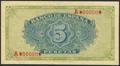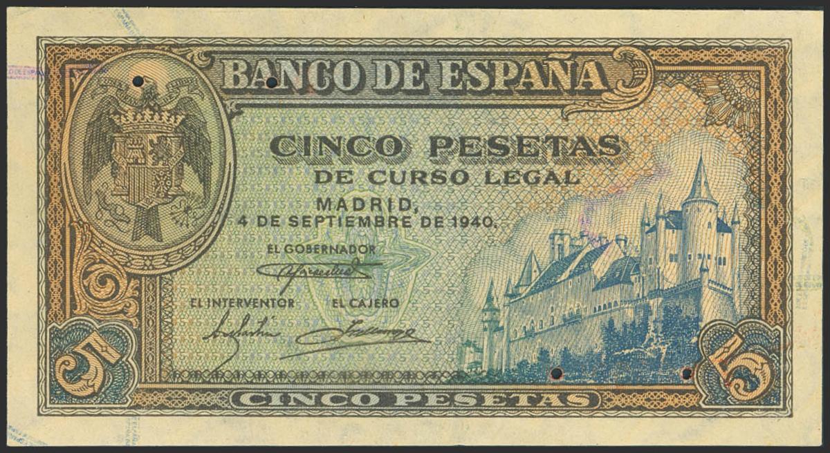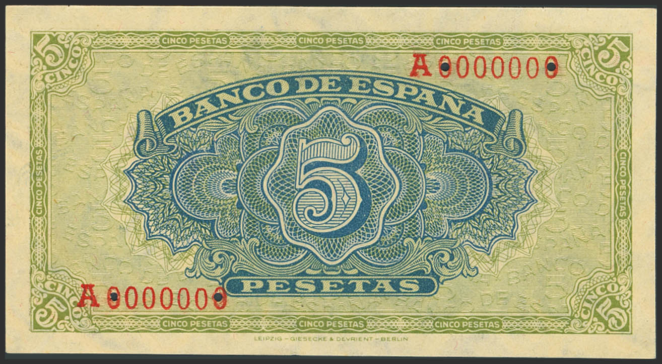 5 Pesetas. 4 de Septiembre de 1940. Serie A y prueba definitiva, numeración A0000000 y pequeños taladros en la numeración. (Edifil 2023: 443P, Cobo: 49a). RarÃsima y pieza de gran espectacularidad, apresto original. SC.