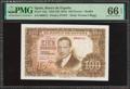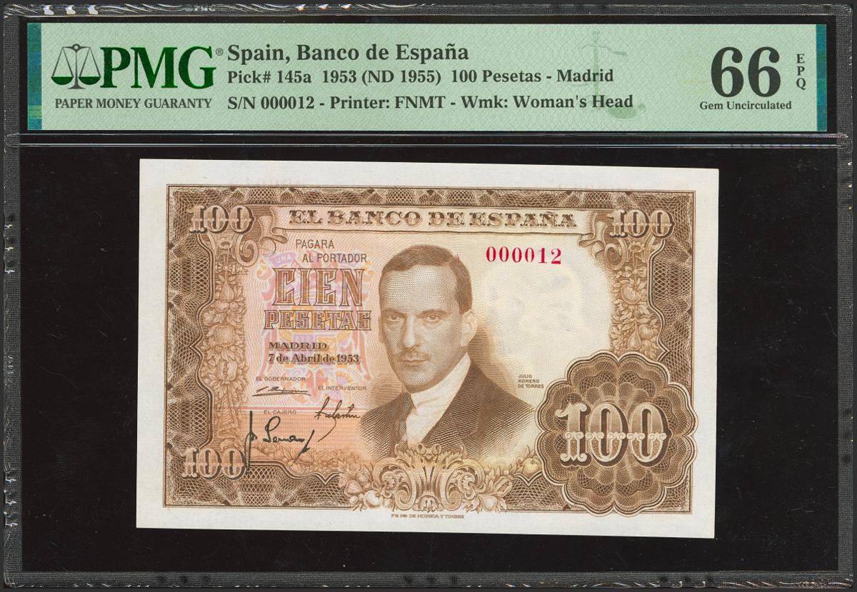 100 Pesetas. 7 de Abril de 1953. Sin serie y numeración extremadamente baja (000012). (Edifil 2023: 464, Pick: 145a). Rarísimo con esta numeración y en esta excepcional calidad, apresto original. SC. Encapsulado PMG66EPQ.