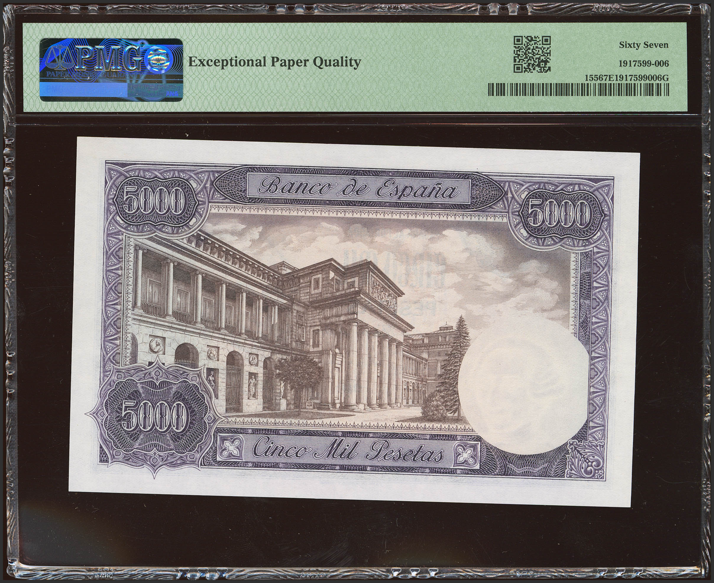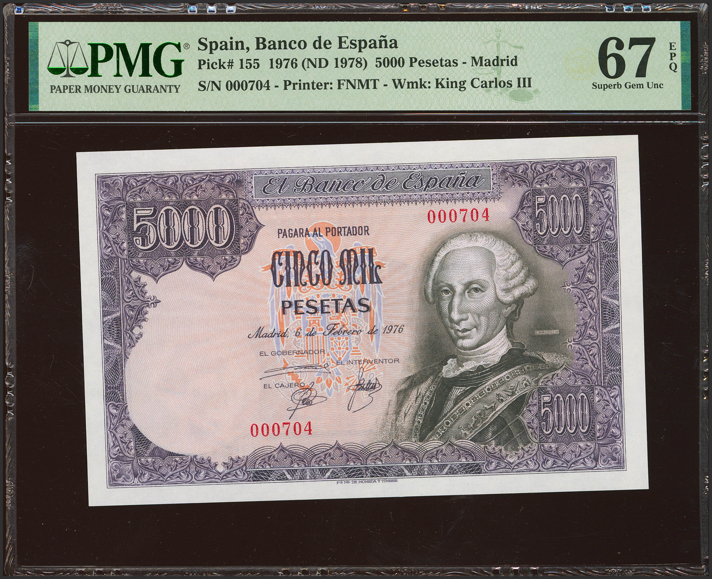 5000 Pesetas. 6 de Febrero de 1976. Sin serie y numeración bajÃsima (Nº000704). (Edifil 2023: 475, Pick: 155). Raro, especialmente en esta excepcional calidad. SC. Encapsulado PMG67EPQ.
