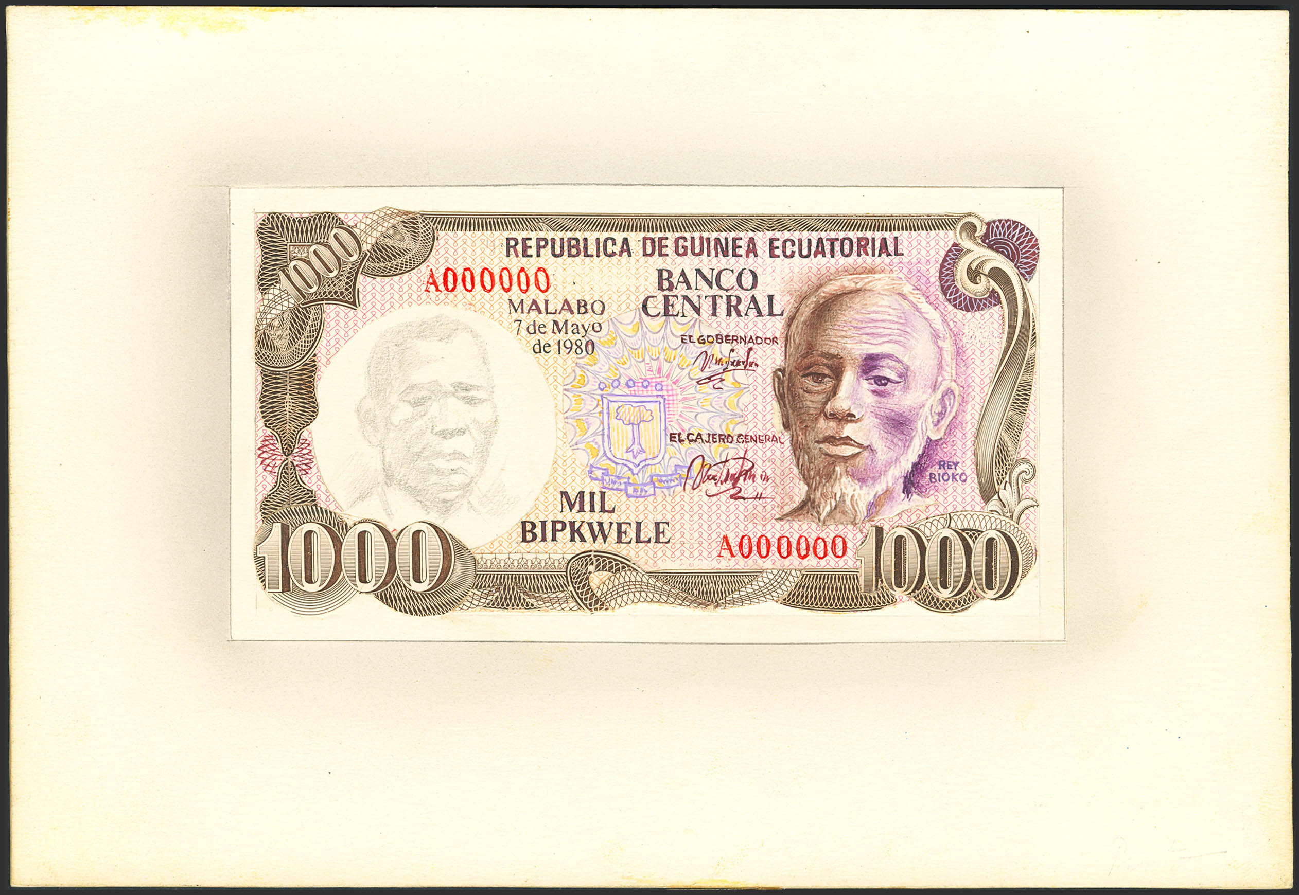 GUINEA ECUATORIAL. 1000 Pesetas. 7 de Mayo de 1980. Prueba de artista del Banco de Guinea de un billete que no llego a ponerse en circulación y elaborada desde el punto de vista artístico artesanalmente, sobre cartulina. Rarísima y espectacular. SC-.