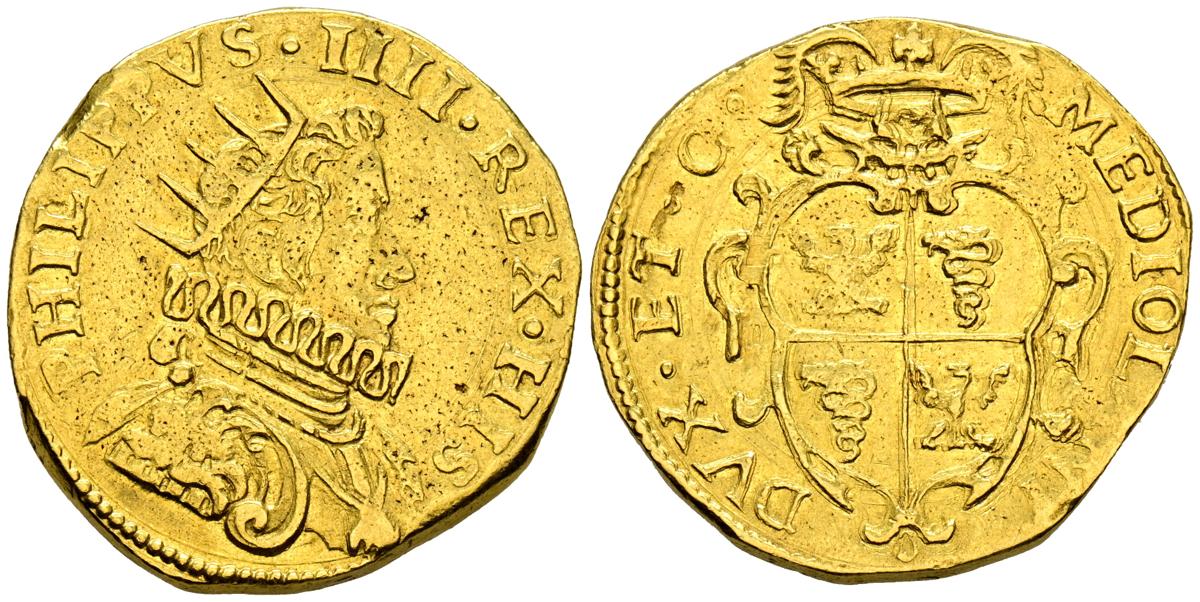 Radiado y con gorguera, un pañuelo ya en desuso que cubría el cuello, este busto de Felipe IV es, probablemente, uno de los más peculiares de cuantos acuñaron los Austrias españoles a lo largo de toda su historia. El reverso tampoco deja indiferente: escudo acuartelado con las armas de las primeras familias señoriales de Milán: los Visconti y los Sforza. La doble doppia o llamada cuadrupla es el equivalente por módulo y peso a las piezas de 4 Escudos, siendo el módulo inferior, la doppia, significativamente más escasa.