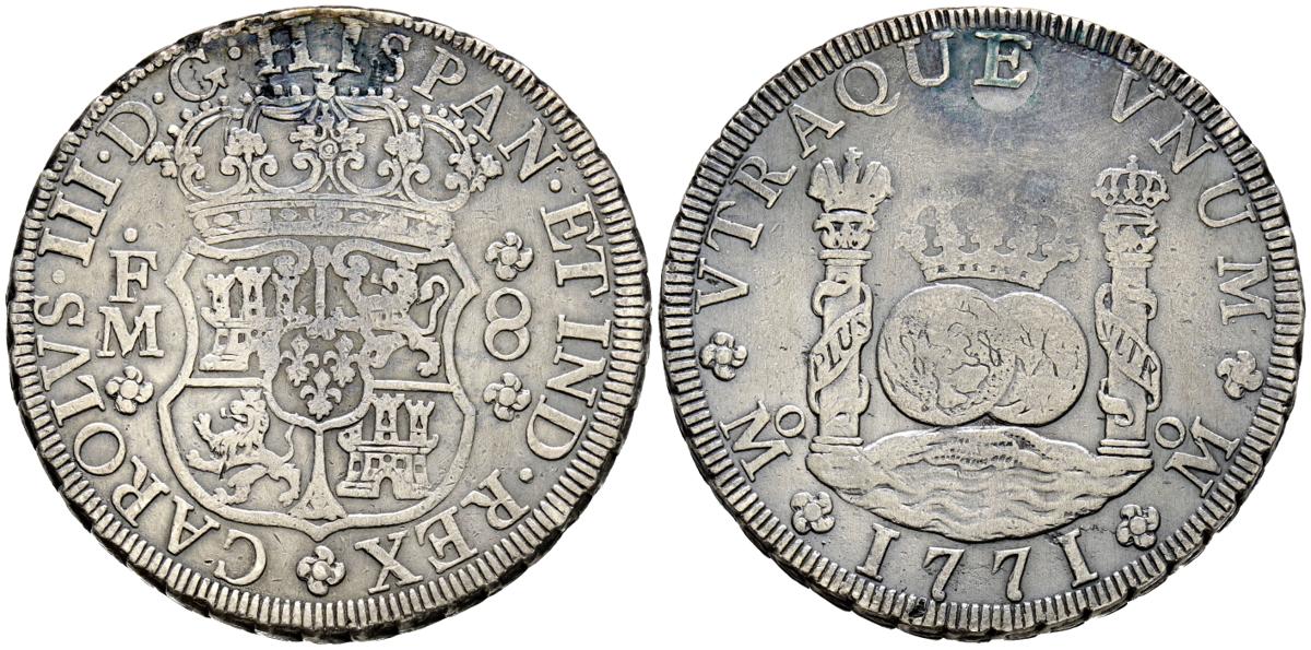 English CARLOS III (1759-1788). 8 Reales. (Ar. 26.75g/40mm). 1771. Mexico MF. (Cal-2019-1103). Very Fine. Hole plugged at 12 o'clock.