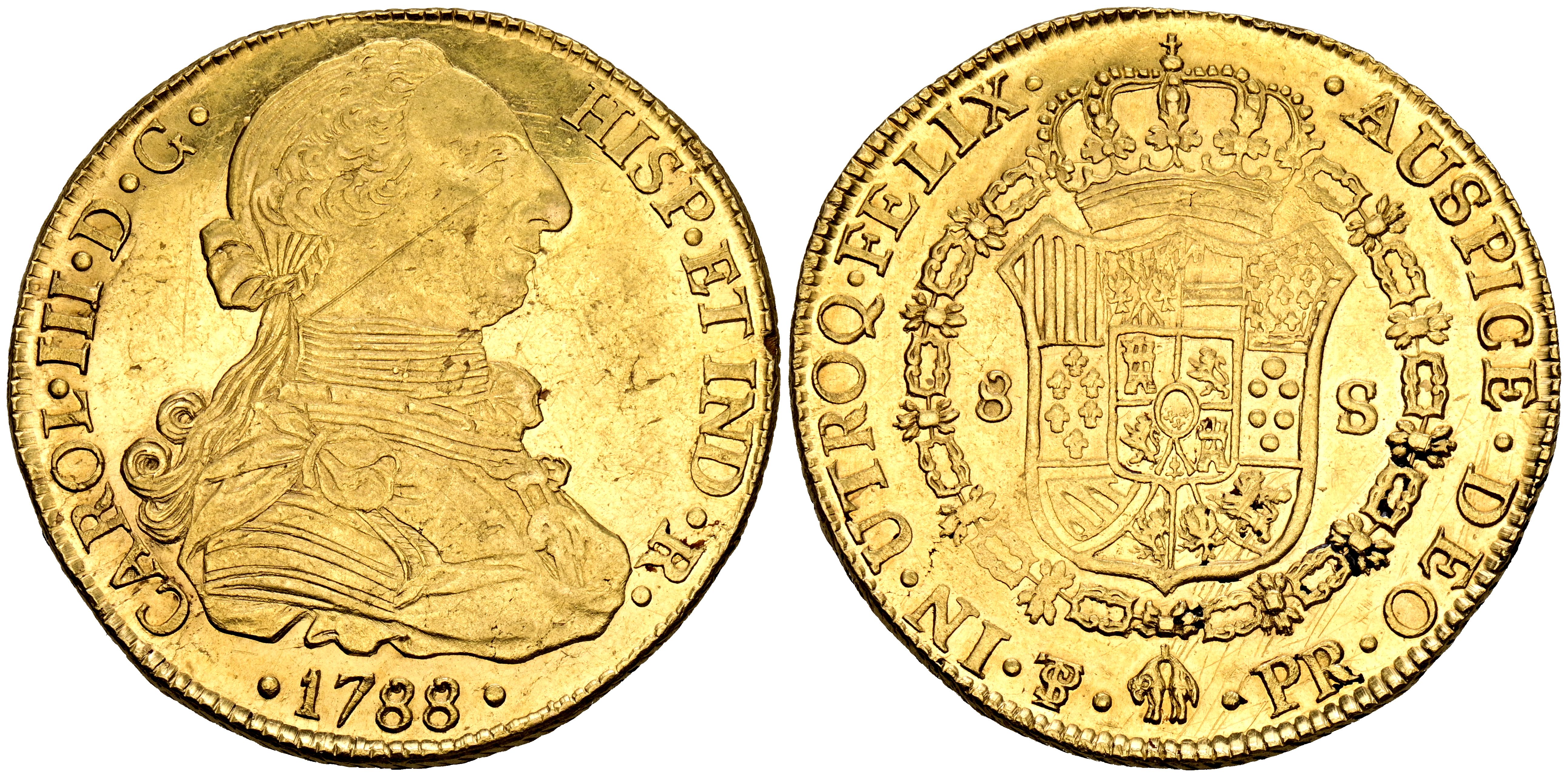 CHARLES III (1759-1788). 8 Escudos. (Au. 26.88g/37mm). 1788. PotosÃ, PR. (Cal. 2019-2075). Extremely Fine. Minor scratches. Traces of original luster, a beautiful example.