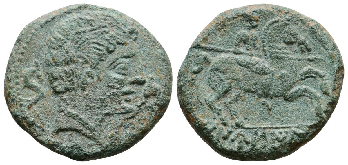 DANUSIA. As. 120-20 a.C. Botija (Cáceres). A/ Busto a derecha entre dos delfines. R/ Jinete con lanza a derecha, debajo DaNUSIA. FAB-894. Ae. 6,70g. MBC-.