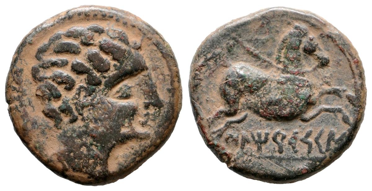 ILTIRCES. Semis. 200-180 a.C. Solsona (Lleida). A/ Cabeza masculina a derecha, detrás espiga. R/ Caballo a derecha, debajo leyenda ILTIRCeS. FAB-1454. Ae. 4,46g. MBC-.