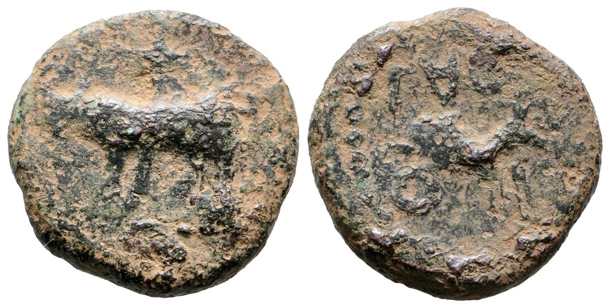 LACIPO. Semis. 50-20 a.C. Casares (Málaga). A/ Toro a derecha encima estrella. R/ Delfín a izquierda, alrededor con leyenda externa LAC-IPO. FAB-1645. Ae. 5,90g. BC-. Rara.